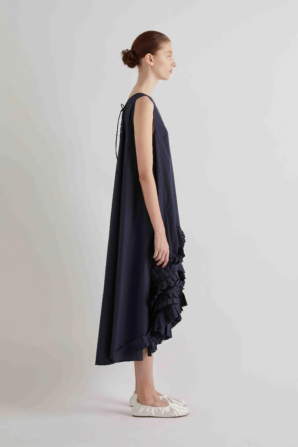 The asymmetric pleated hem adds texture, depth and visual interest, creating a feminine yet architectural effect.
