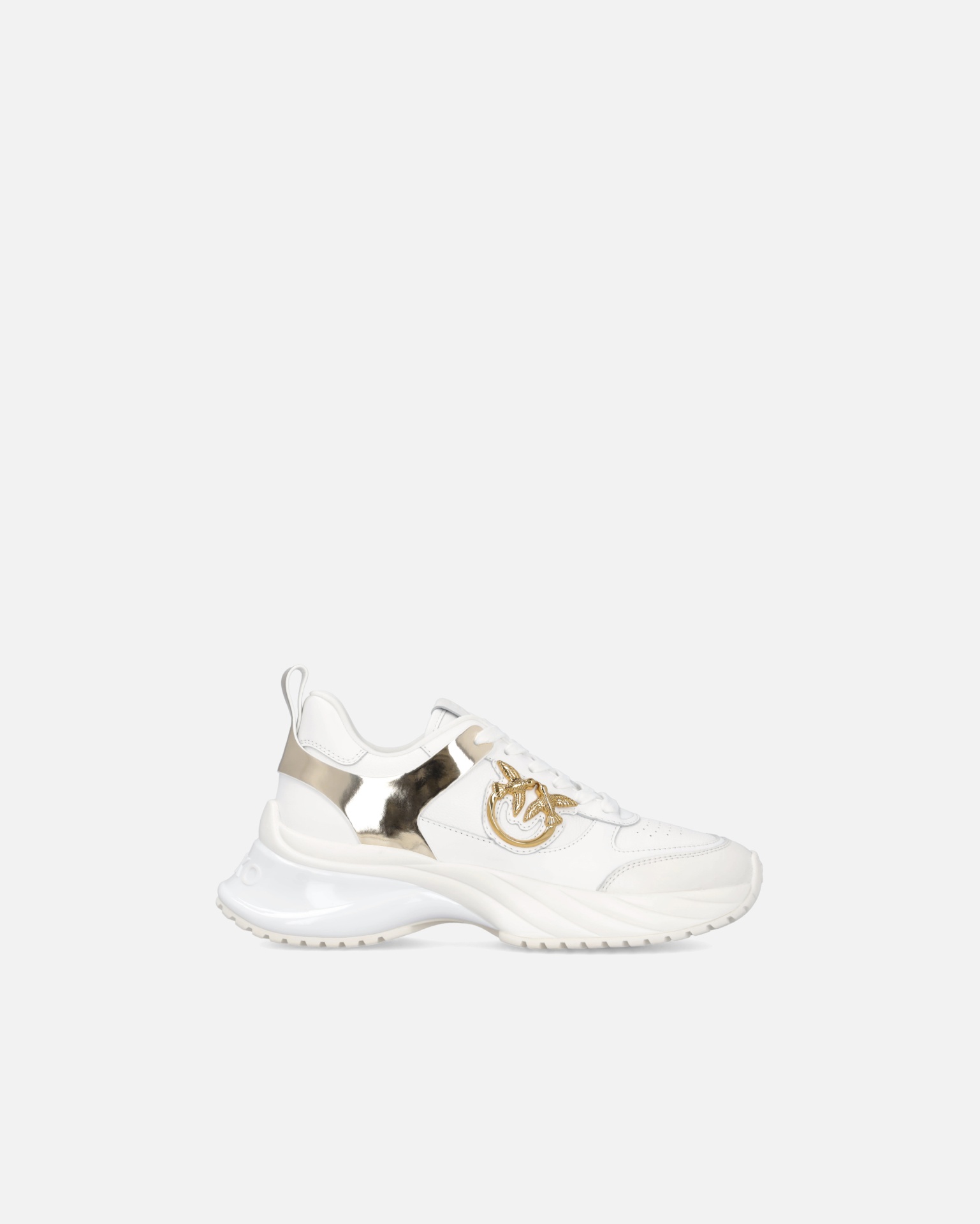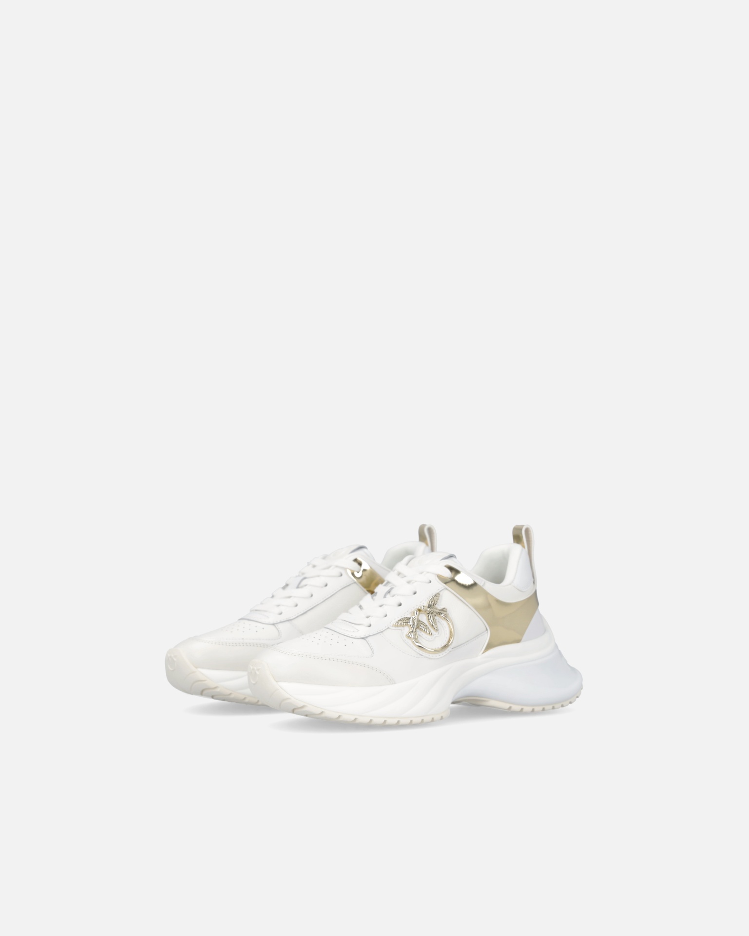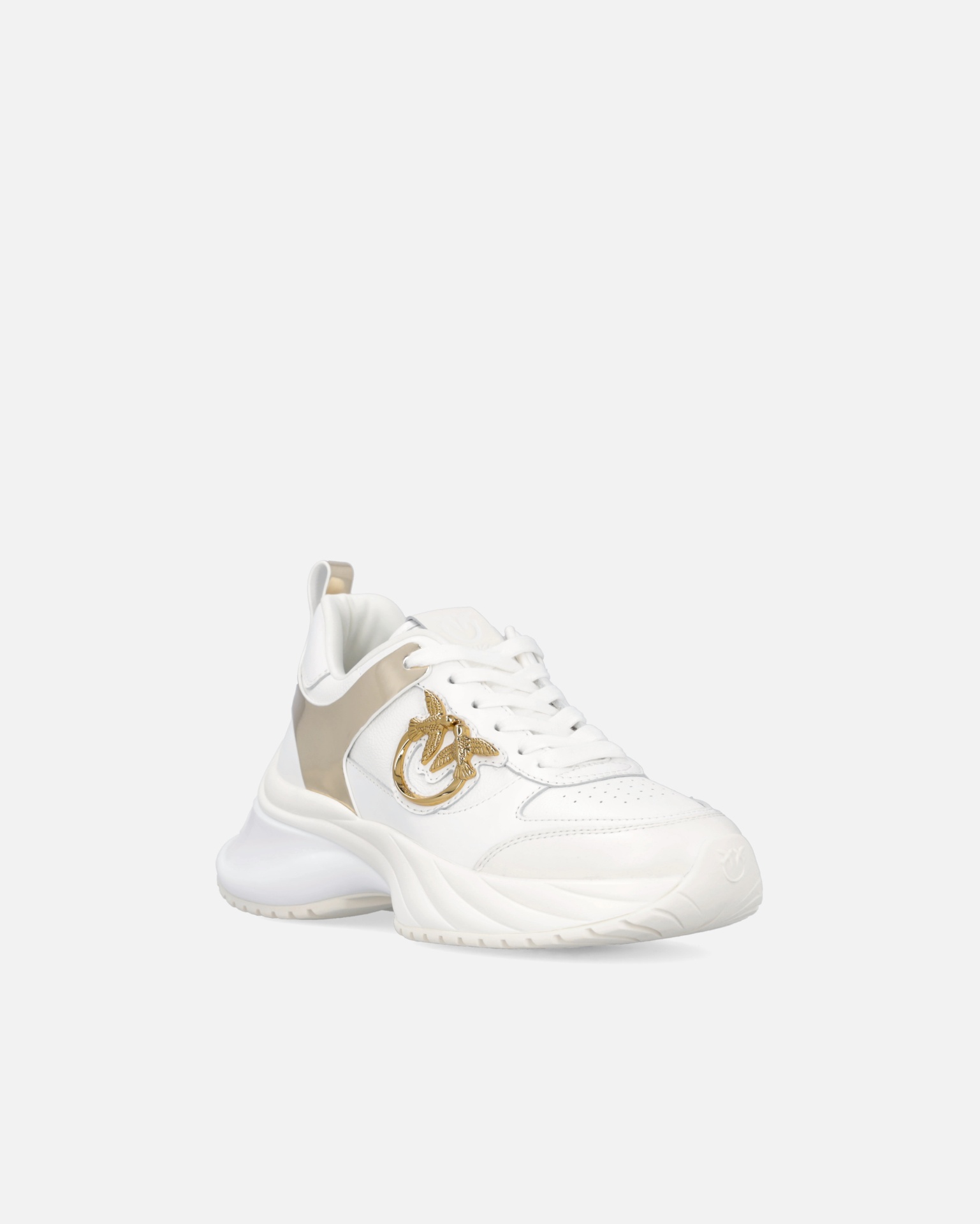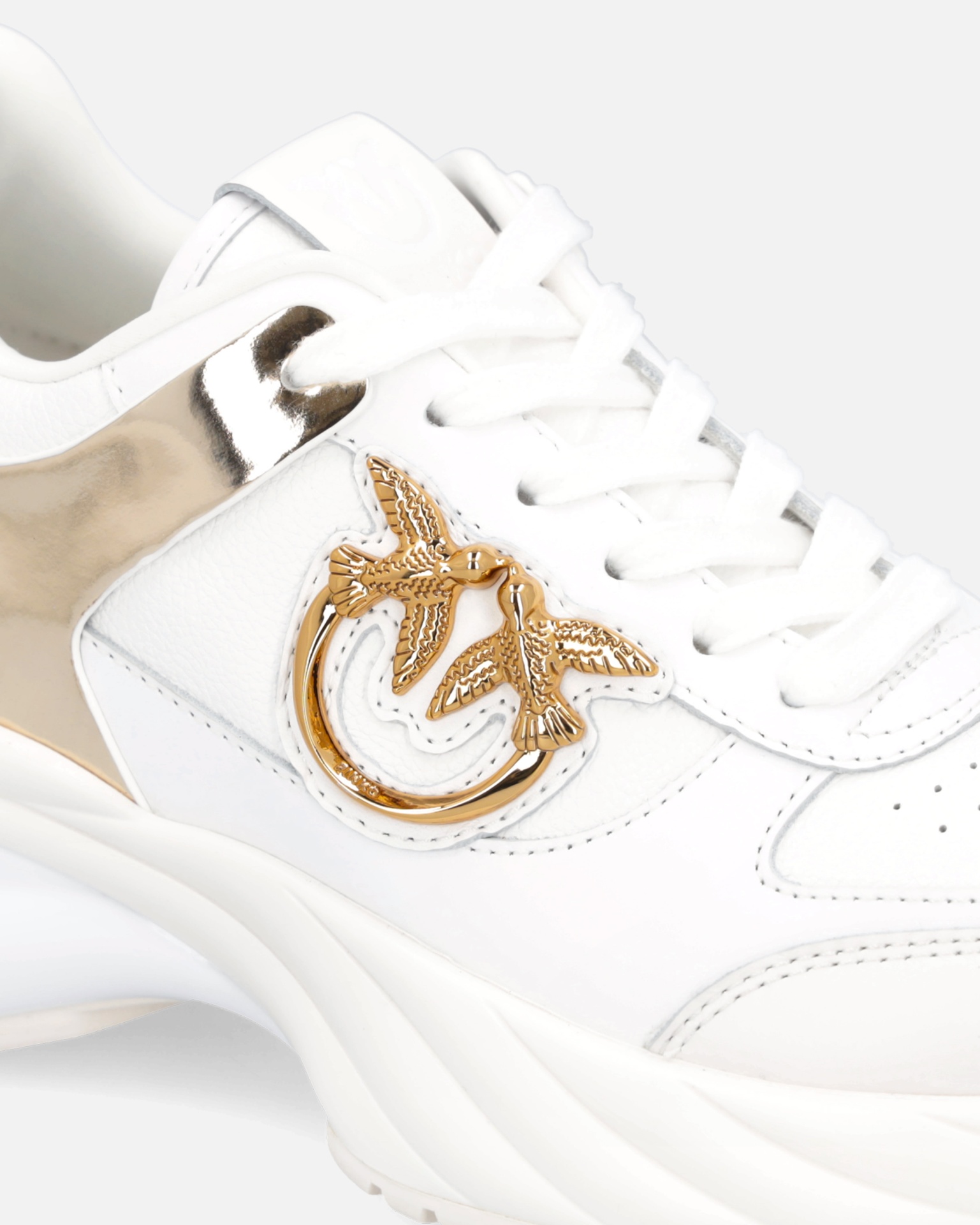Crafted from hammered and smooth leather-effect panels, they feature metallic mirror inserts, the gold-tone Love Birds emblem, and a 7 cm moulded running sole with glossy TPU spoiler and embossed logo.