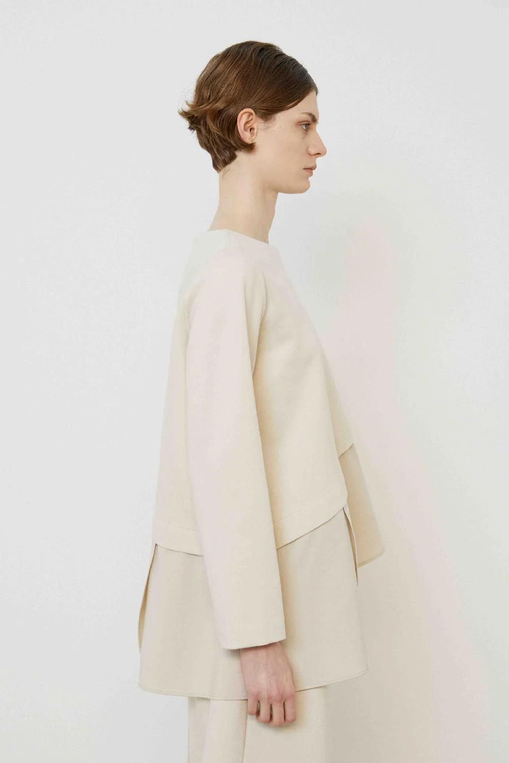 Apresenta um decote barco, bainha assimétrica com aberturas laterais e um leve folho sobreposto na parte inferior, criando um efeito arquitetónico subtil e sofisticado.
