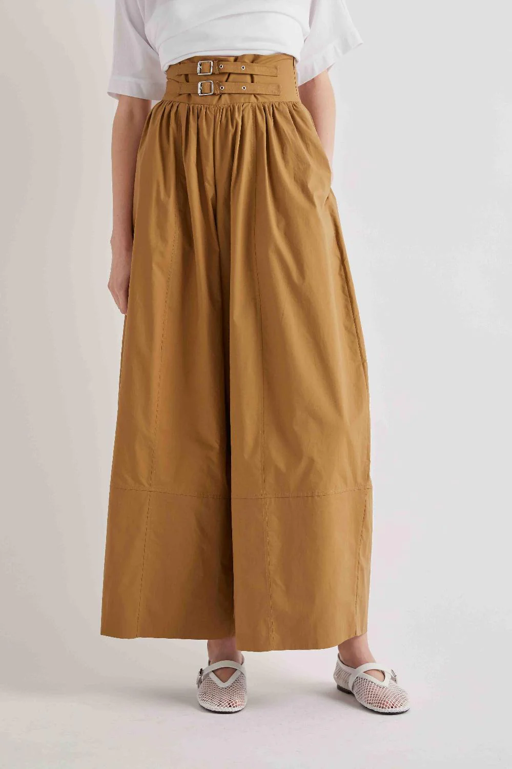 The structured high waistband with double buckles adds definition and visual presence, while the gathered back panel introduces comfort and subtle stretch.