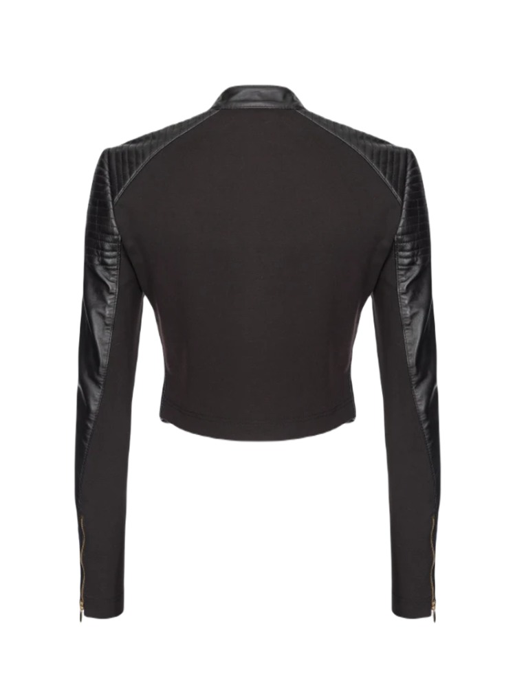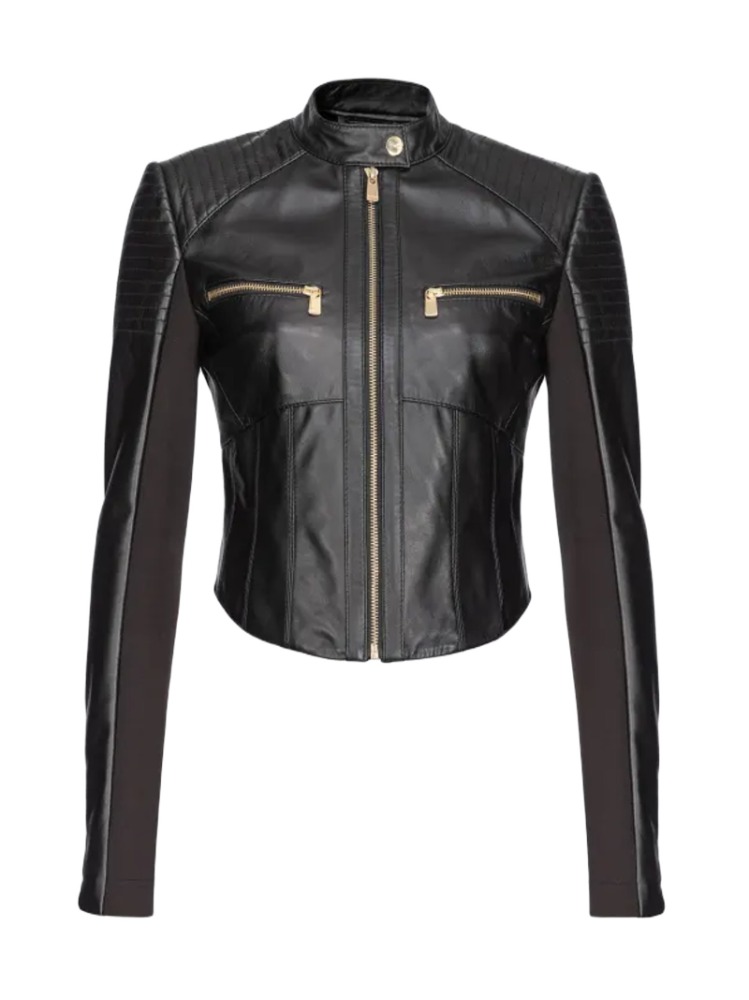 Casaco biker curto em pele preta com mangas em jersey técnico. Fecho frontal com zip metálico dourado e bolsos frontais com fecho. Corte justo e ombros estruturados para uma silhueta feminina com atitude.