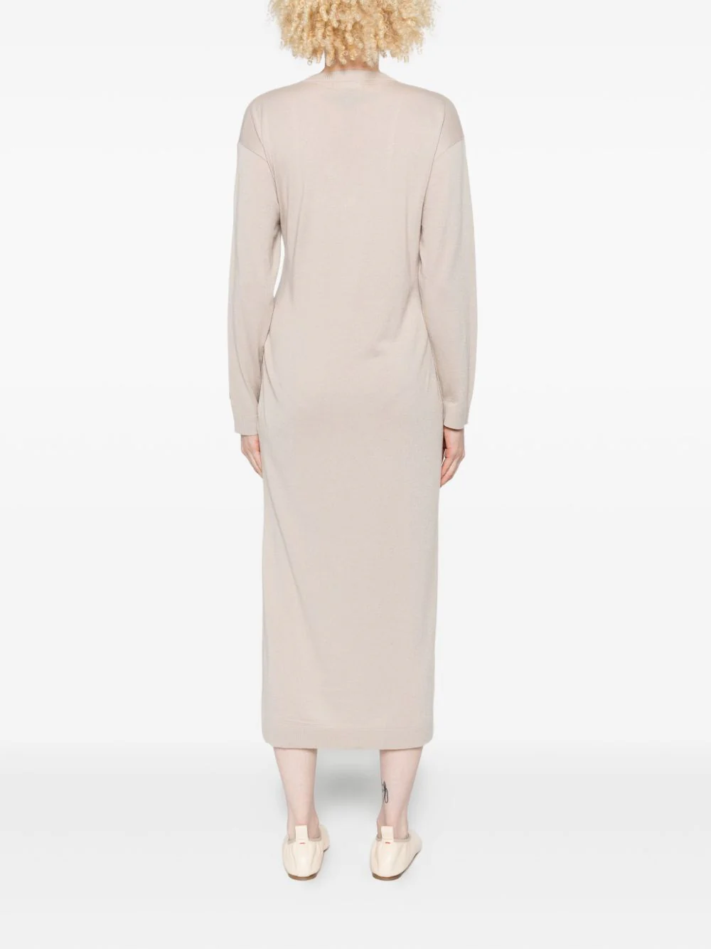Vestido midi em malha fina de toque suave, com decote em V e mangas compridas. O nó frontal ajustável molda a silhueta com naturalidade, conferindo-lhe estrutura e feminilidade sem esforço.