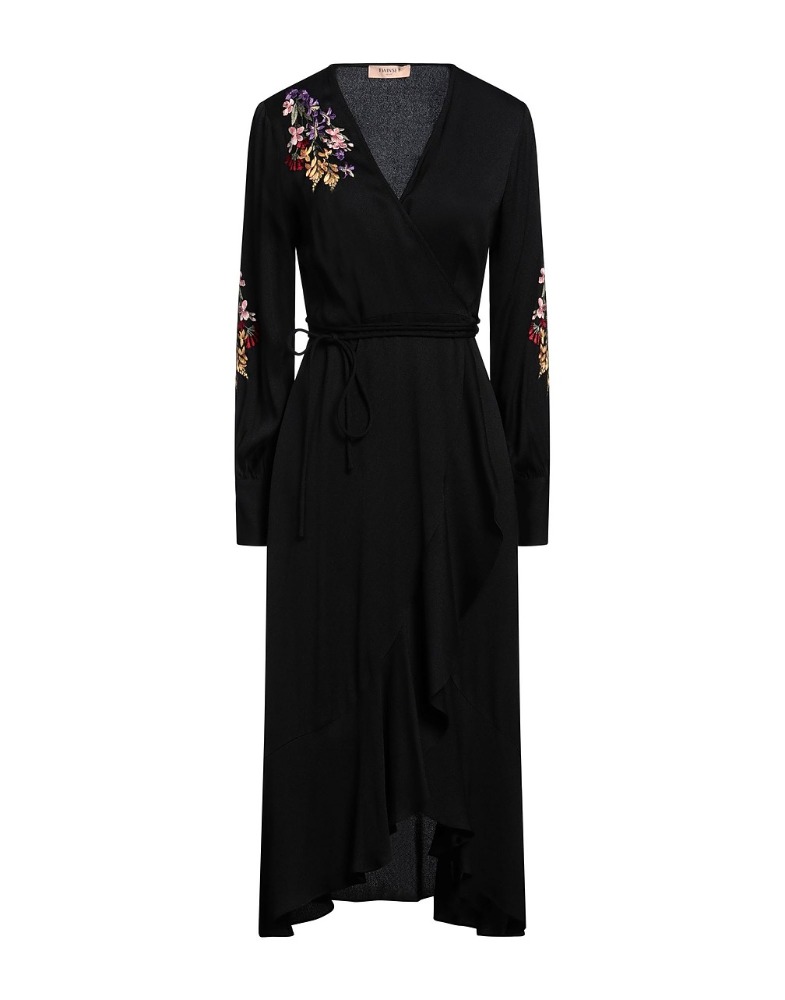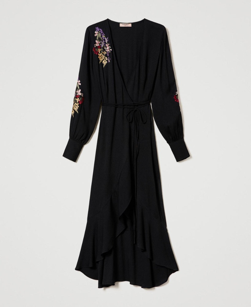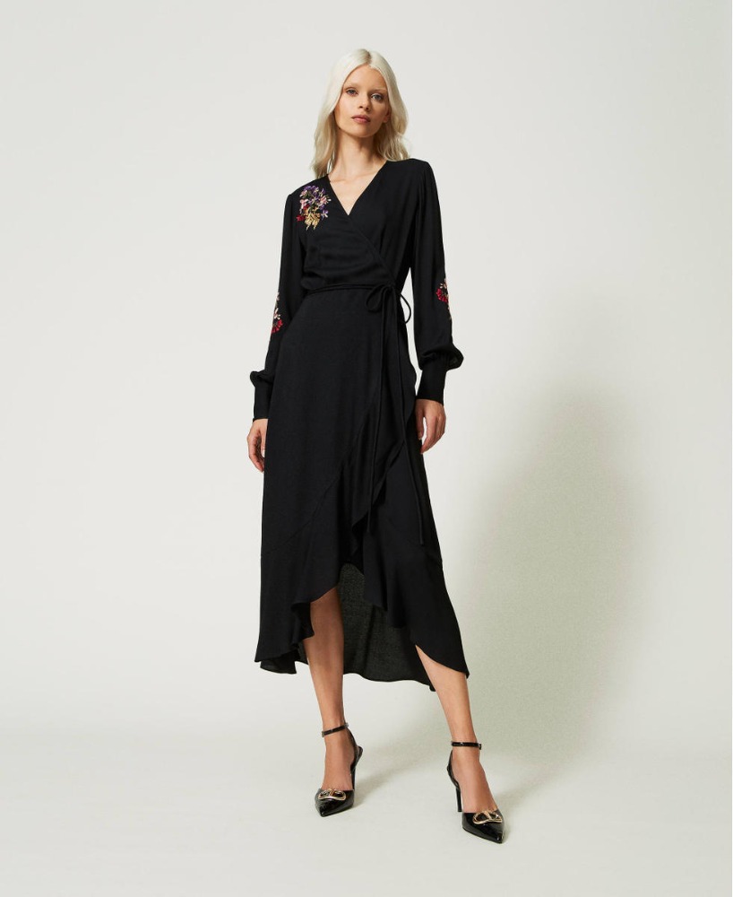 Midi wrap dress in fluid fabric, featuring vivid floral embroidery on the shoulders and sleeves. The V-neckline and adjustable tie waist enhance the silhouette with feminine elegance and natural movement.