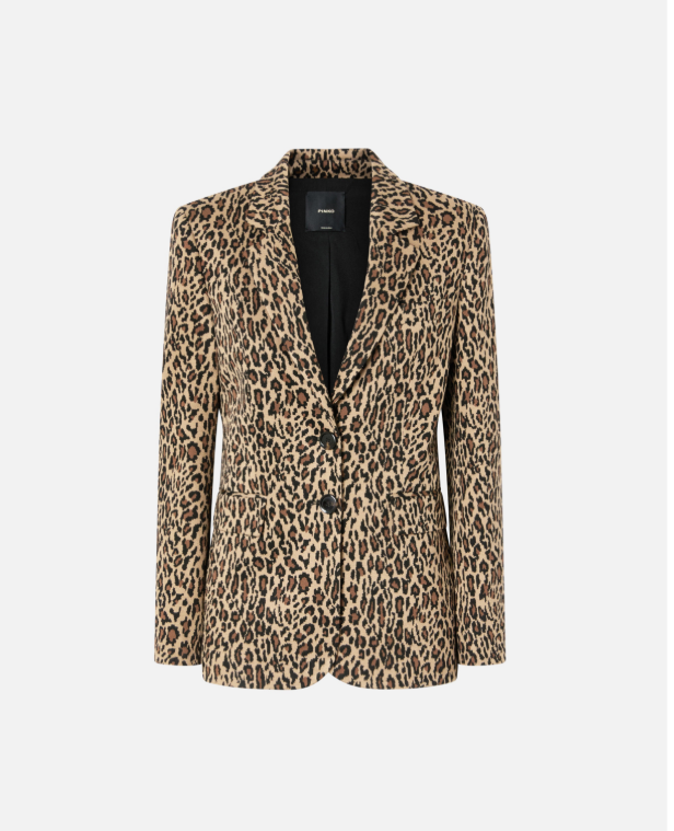 Tailored blazer in signature Pinko leopard print. Featuring a fitted silhouette and covered front buttons, it combines confidence with refined femininity. A timeless wardrobe essential reimagined for women who move seamlessly between elegance and edge.