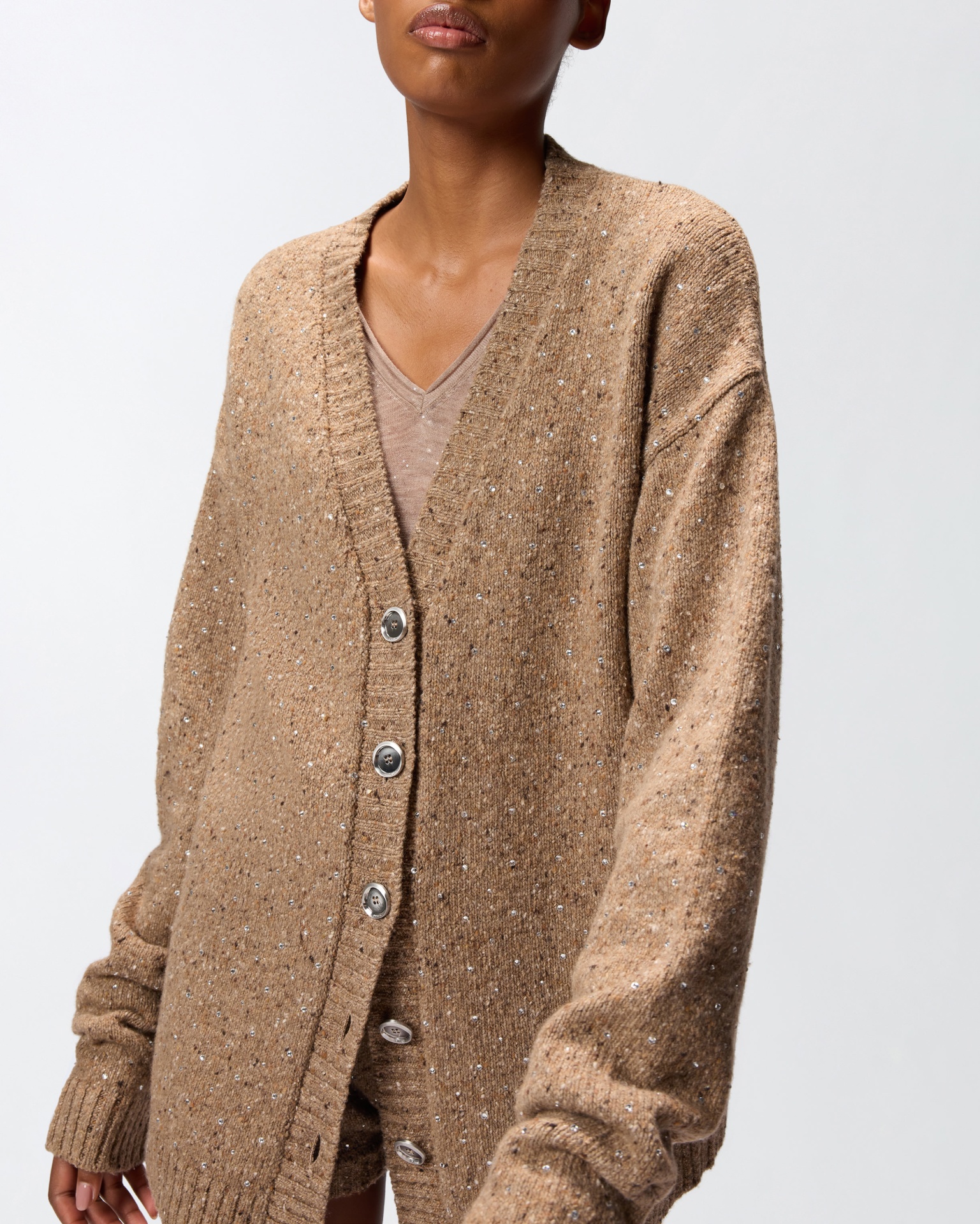 Long-sleeved bouclé cardigan featuring a comfortable, enveloping silhouette and dotted with tiny rhinestones for a touch of understated sparkle.