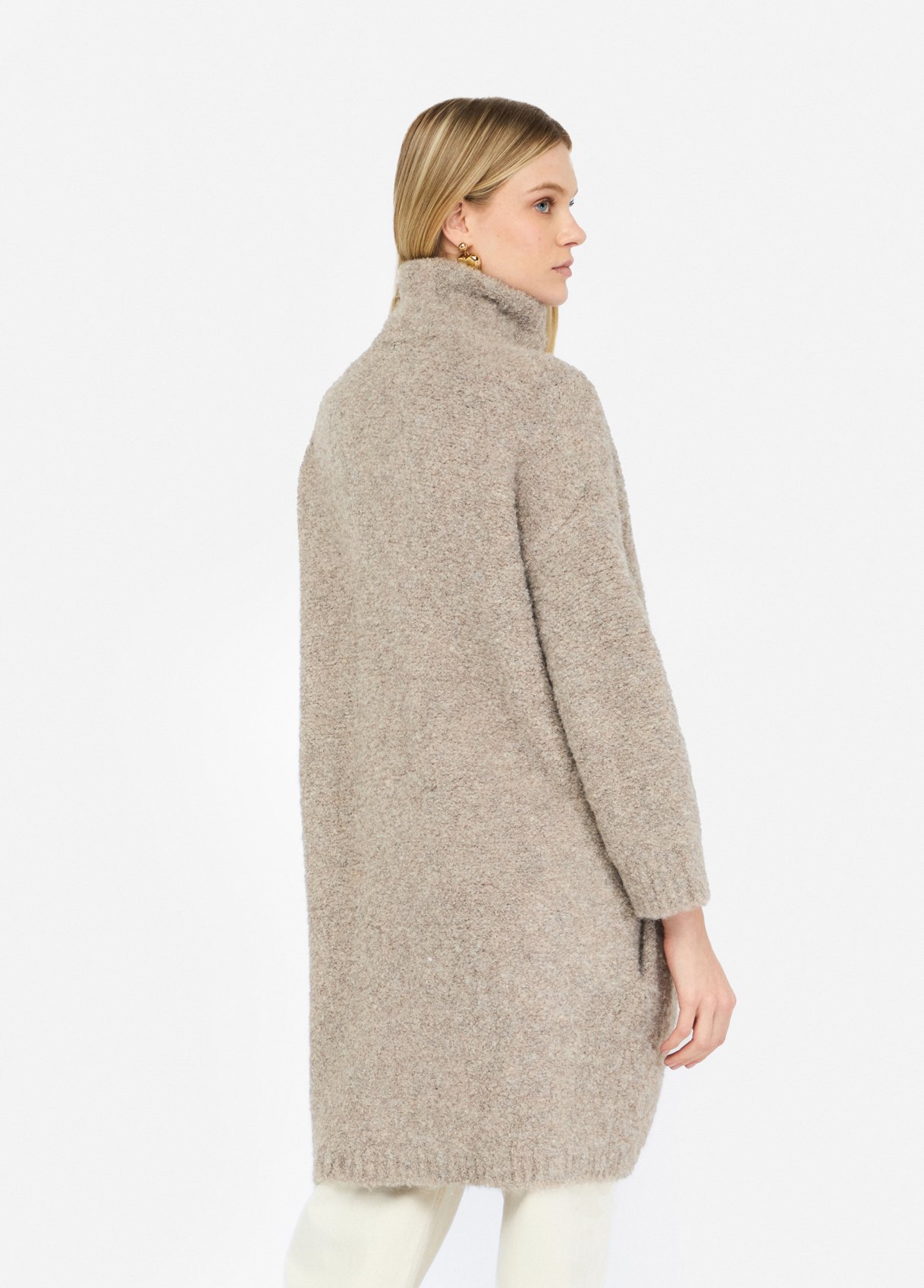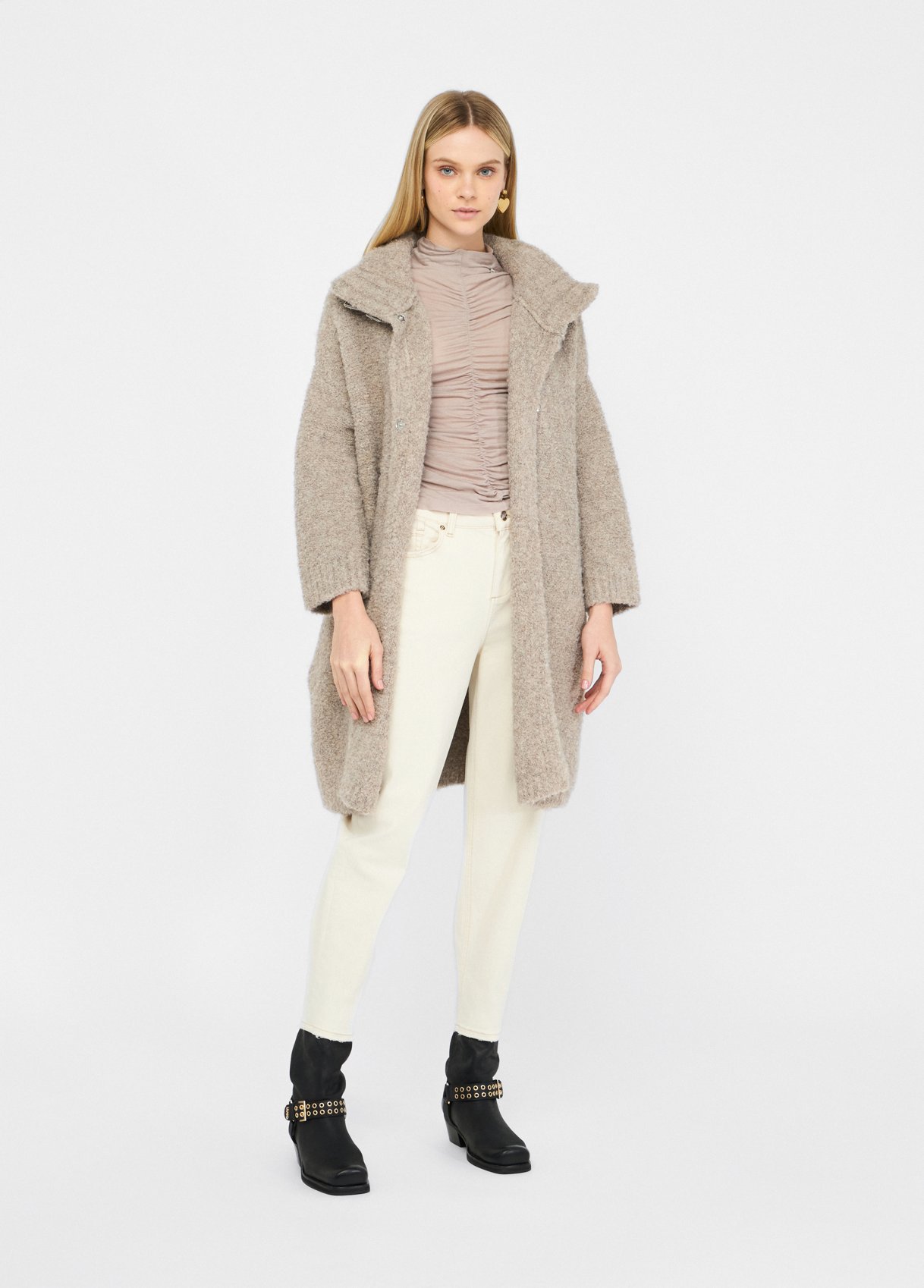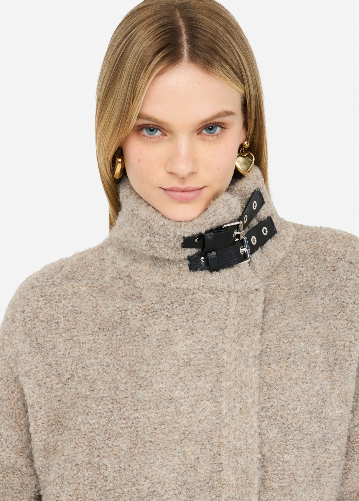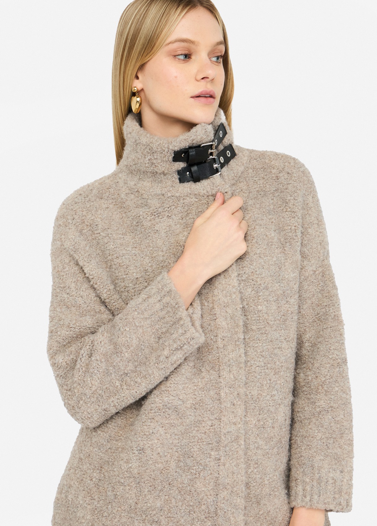 Beige knit coat crafted from a soft wool-blend bouclé weave. Featuring a high collar with adjustable faux-leather buckles, lined interior, and practical side pockets, this piece combines tactile comfort with refined structure. A timeless expression of understated elegance — effortlessly aligned with the quiet luxury mood of raquelprates.com.