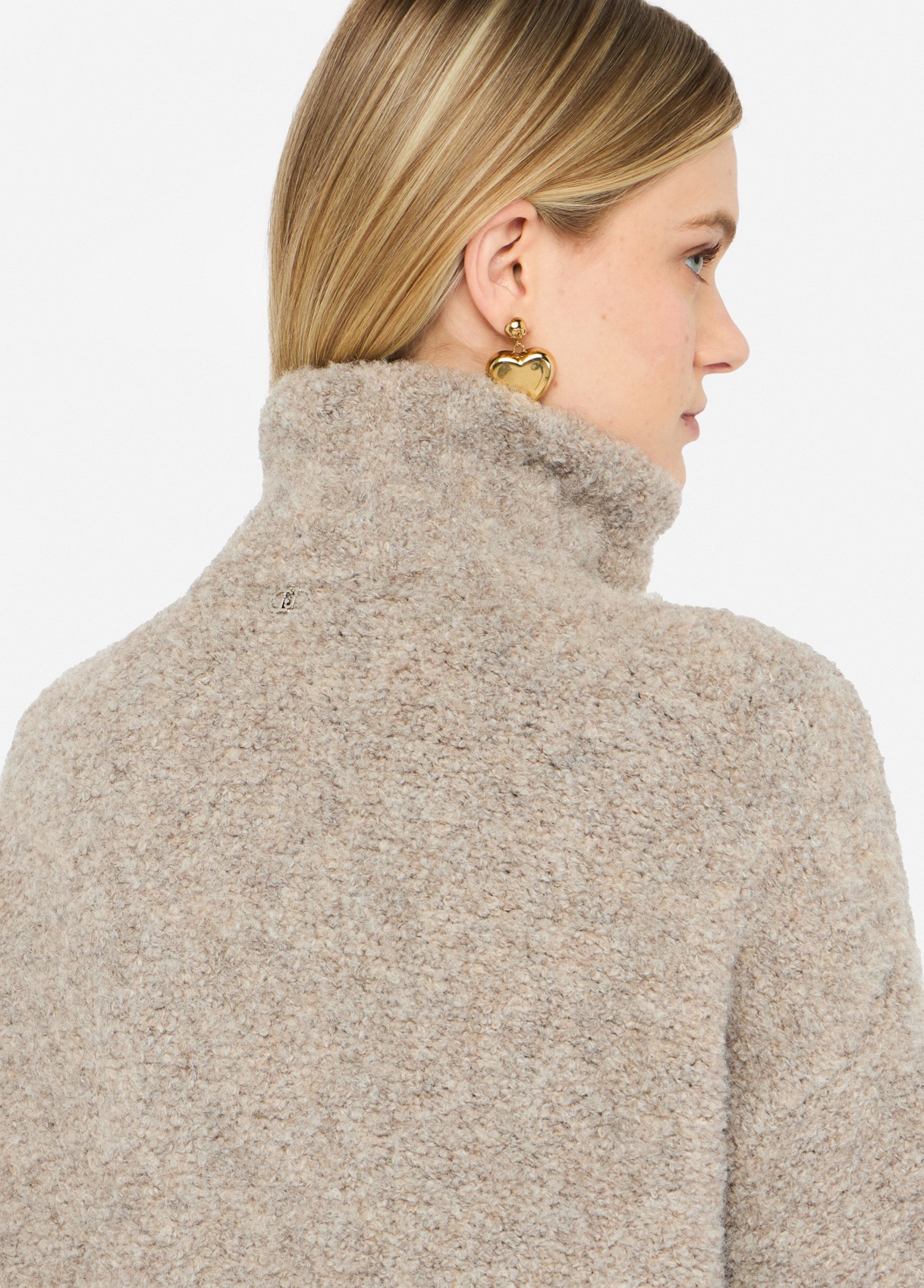 Casaco em malha bouclé bege, confecionado em fios mistos de lã que oferecem textura e conforto térmico. O colarinho alto com fivelas ajustáveis em pele sintética confere-lhe um toque contemporâneo e sofisticado, enquanto o interior forrado e os bolsos laterais asseguram conforto absoluto. Uma peça essencial que conjuga estrutura e suavidade — o verdadeiro espírito do “luxo silencioso” de raquelprates.com.