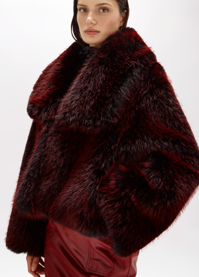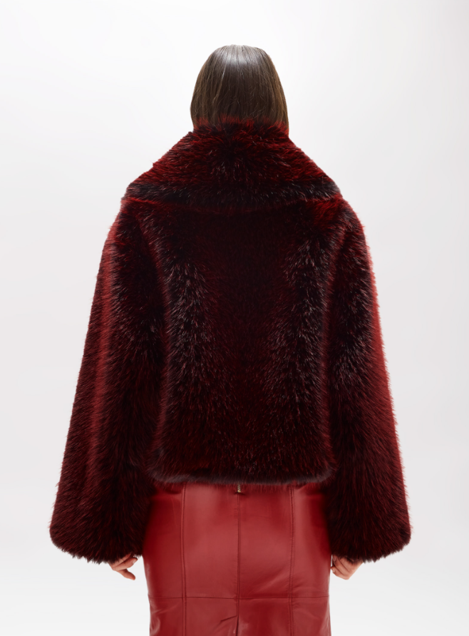 Short faux-fur jacket in deep wine shades with shaded tips and a soft fox-effect texture.