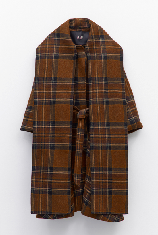Sobretudo em mistura de lã com padrão tartan em tons de castanho e caramelo, reinterpretado com um corte fluido e gola larga tipo capa.