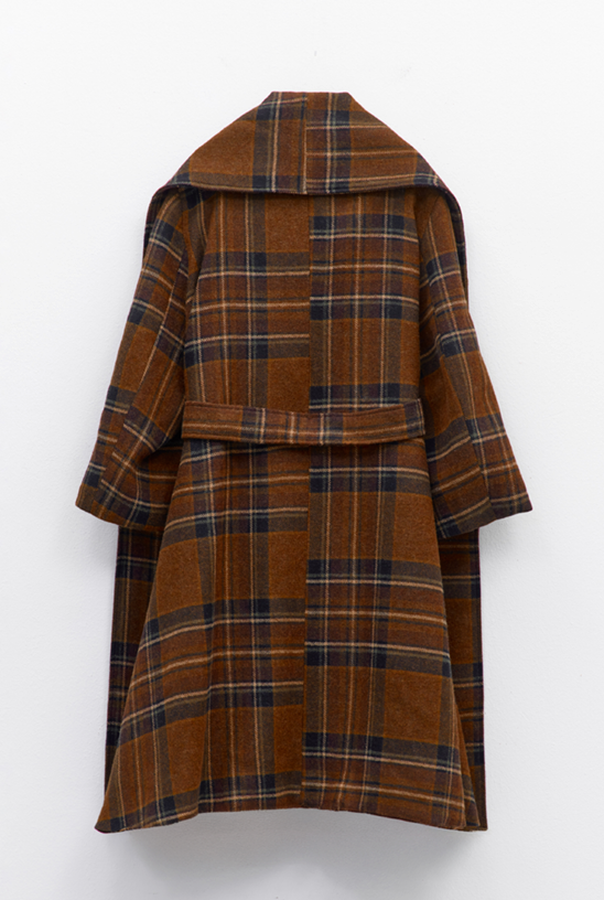 Brown tartan wool-blend coat featuring a wide cape-style collar, fluid silhouette and matching fabric belt.