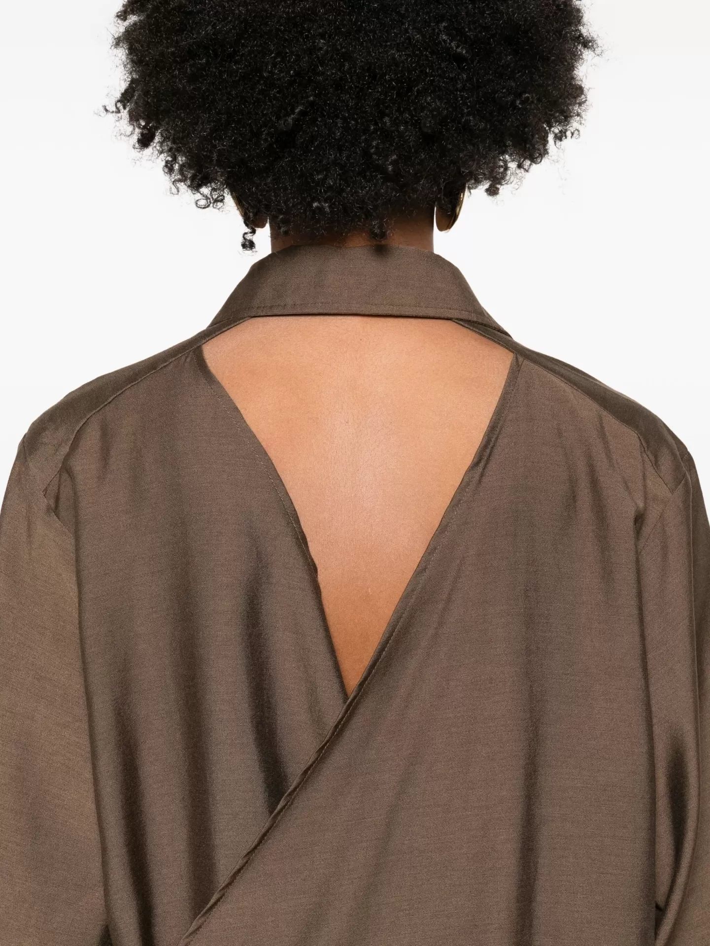 Camisa oversized em tom castanho com detalhe drapeado e aberto nas costas, criando uma silhueta envolvente e fluida.