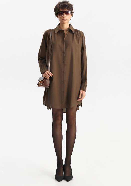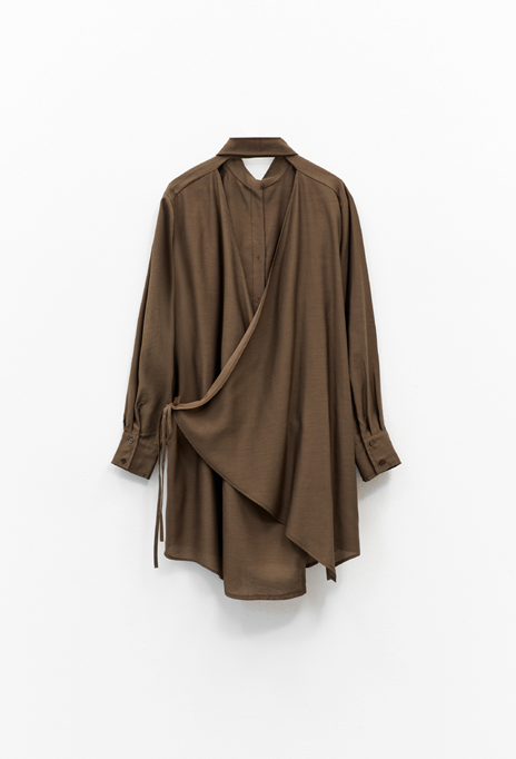 Oversized brown shirt featuring a back drape detail that creates an effortlessly fluid silhouette.
