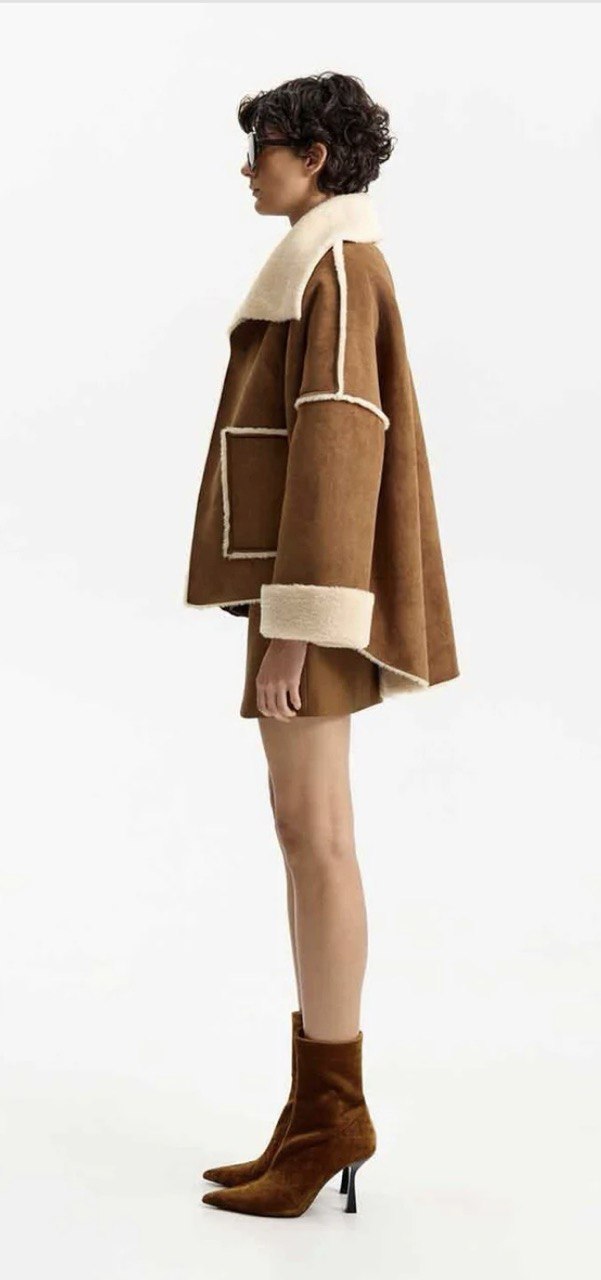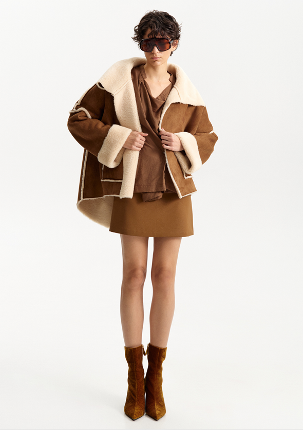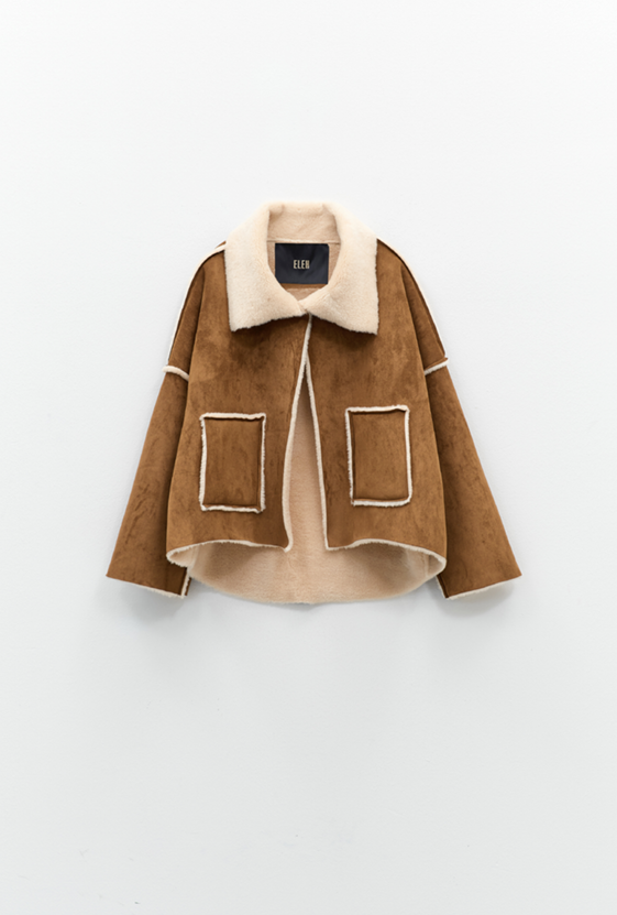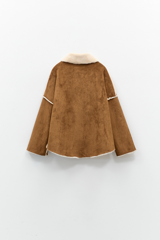Short faux shearling jacket in a two-tone design, featuring a soft suede-effect exterior in brown and a plush cream interior.
