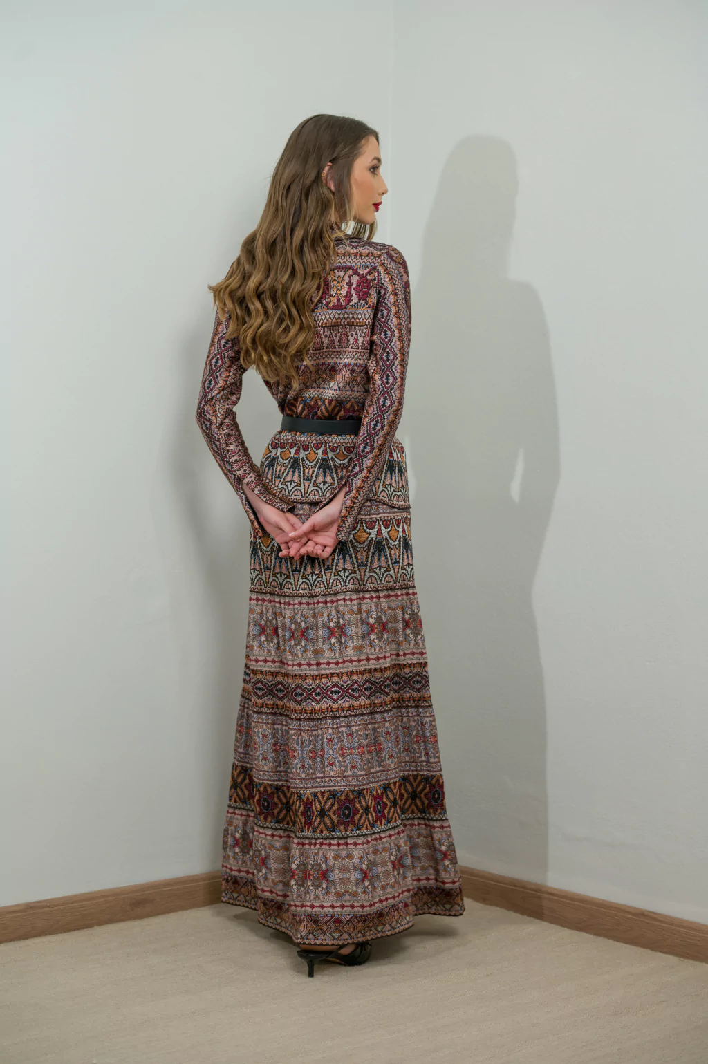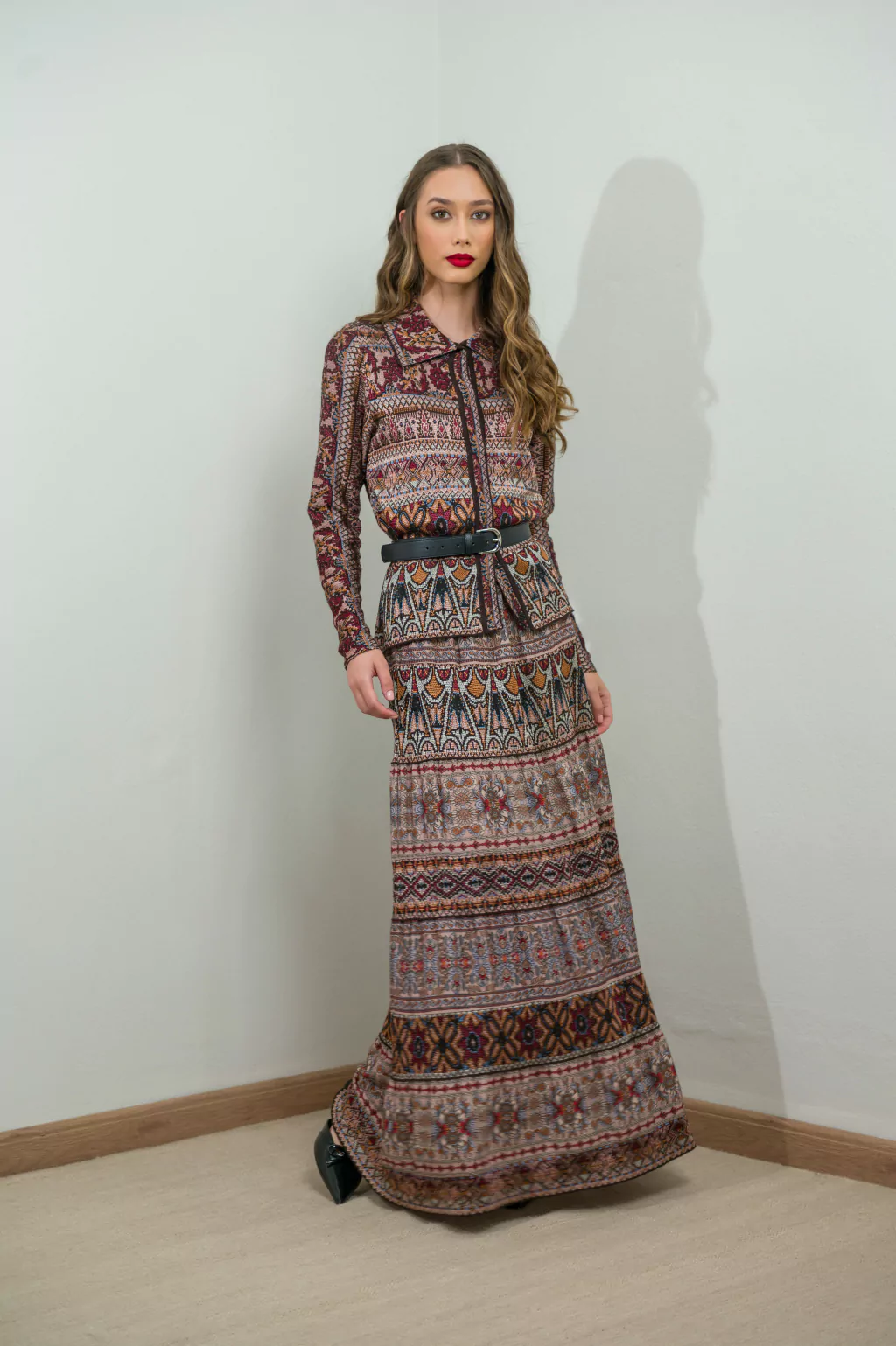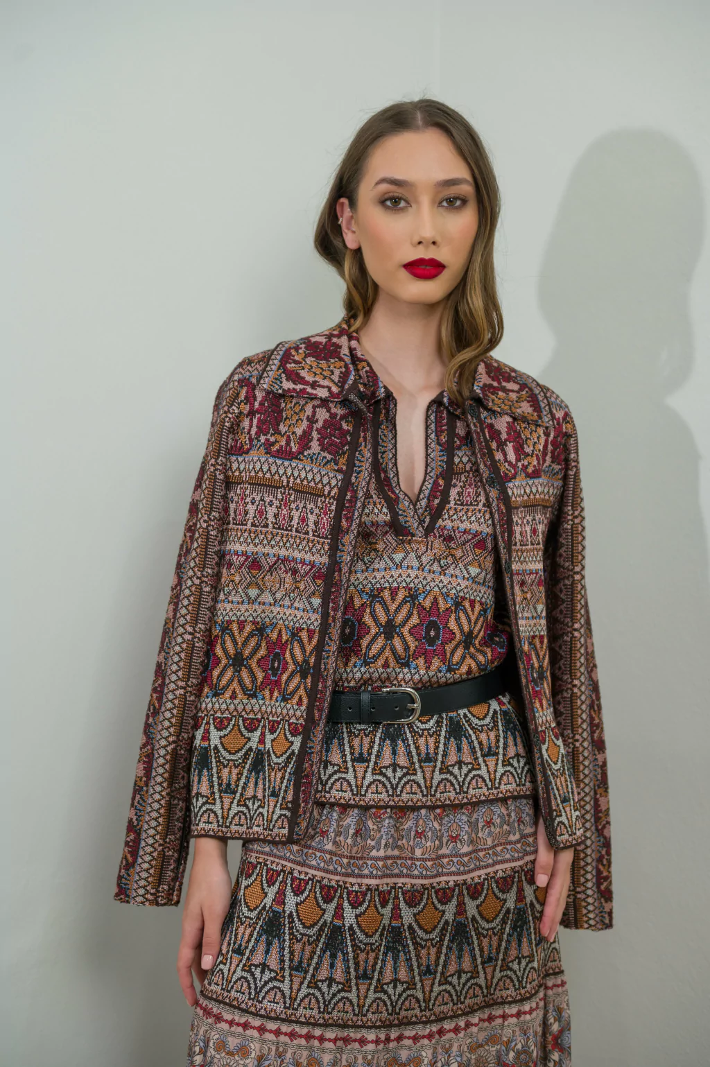 O Casaco em Tricot Estampado Boho apresenta-se como uma peça de impacto, perfeita para quem procura aliar conforto e sofisticação. A malha trabalhada exibe padrões geométricos e florais em tons quentes de vinho, castanho e bege, remetendo ao espírito boho — livre, artístico e cheio de personalidade. O corte estruturado com gola clássica torna-o versátil para coordenados urbanos ou descontraídos.