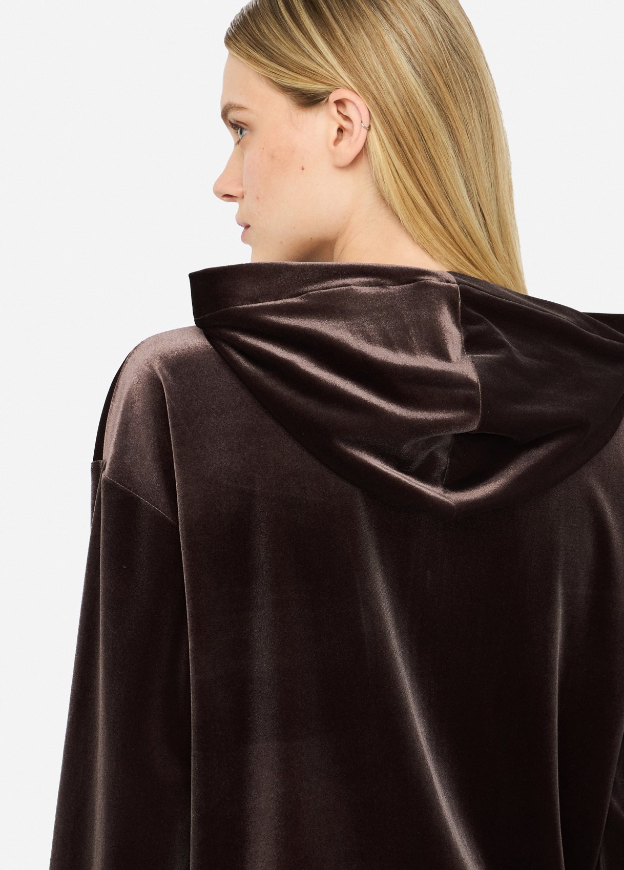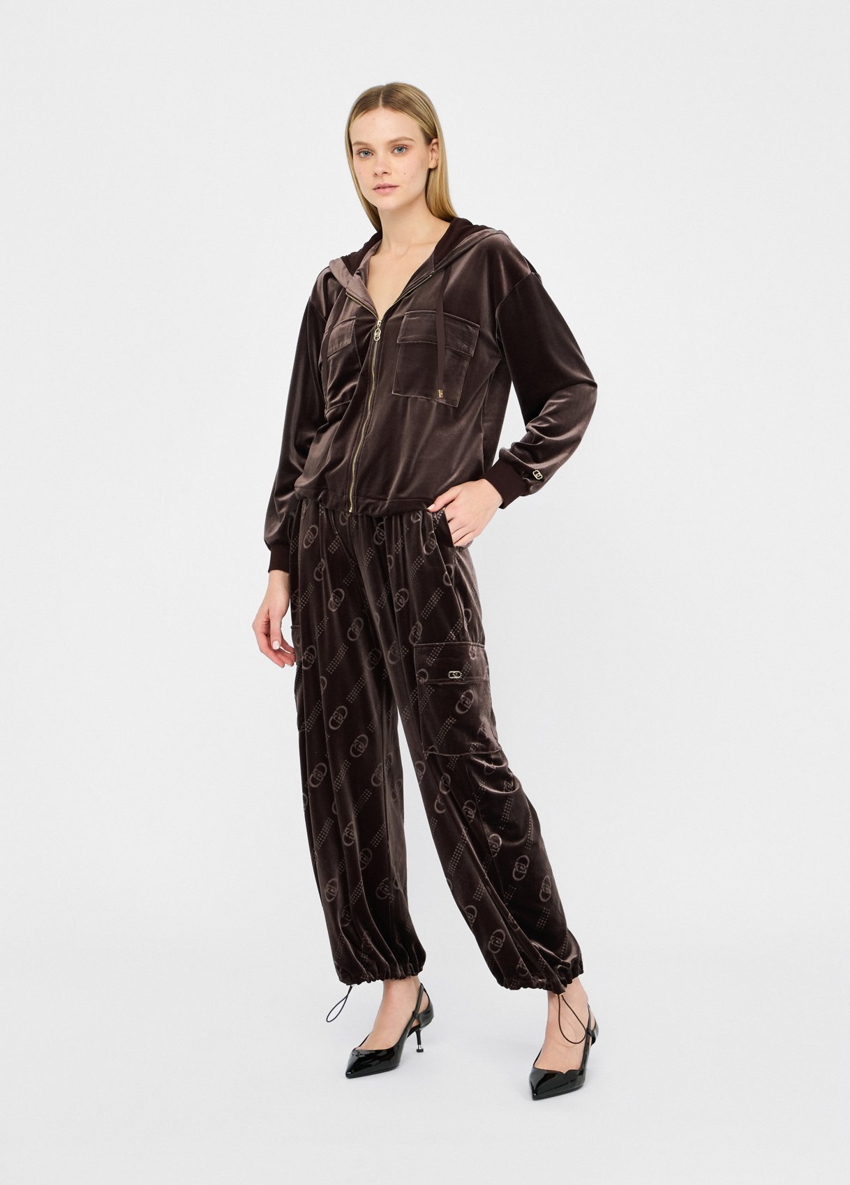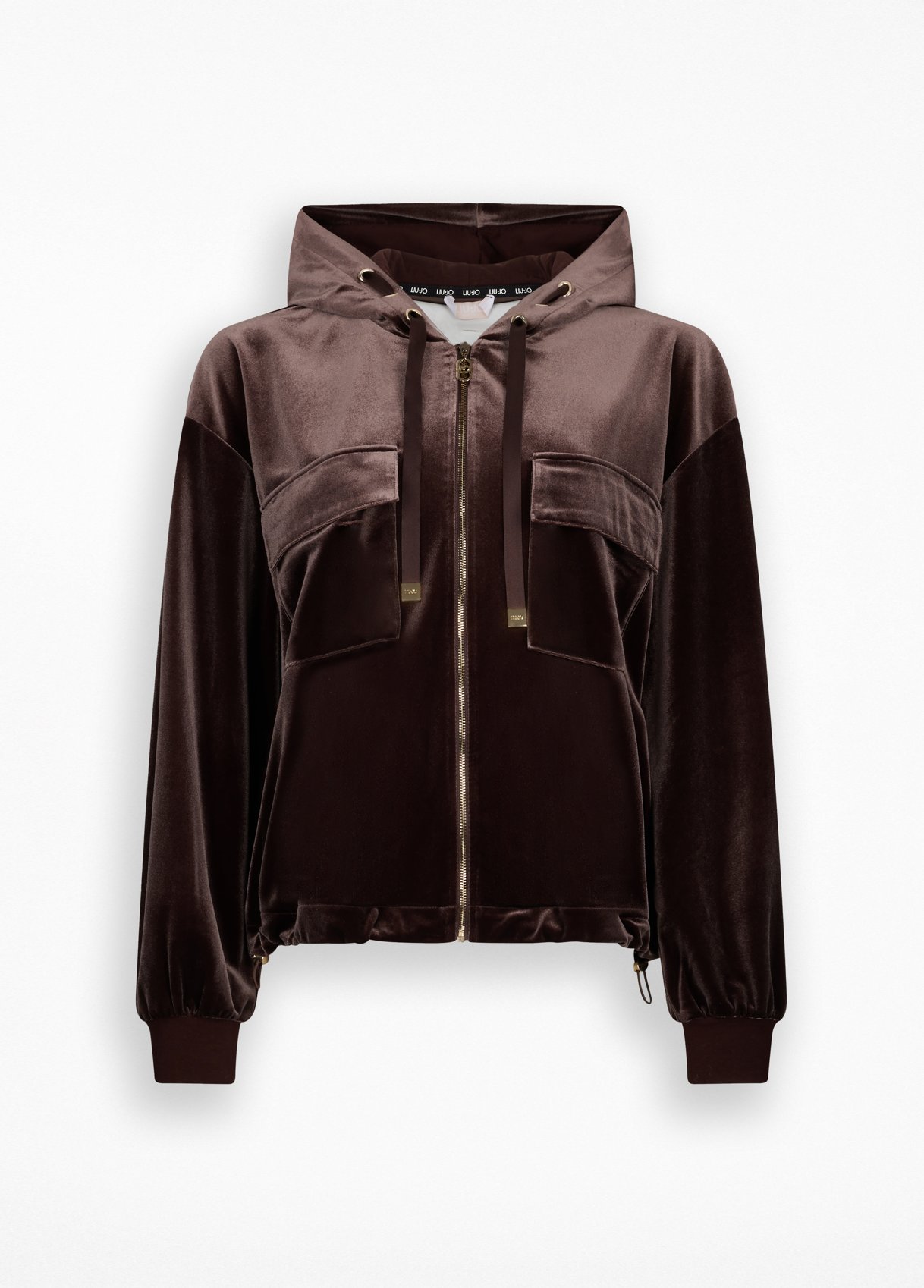 Hooded sweatshirt crafted from stretch chenille with a soft, luminous finish. Featuring a zip-up front, flap chest pockets and refined metal logo detailing, this piece perfectly balances comfort and sophistication. A contemporary take on a timeless wardrobe essential, infused with the effortless elegance of Liu Jo.