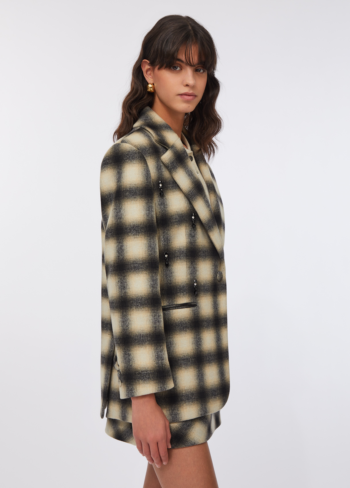 Wool-blend blazer featuring a soft smoky check pattern and delicate jewel embroidery on the front. Designed with classic lapels, welt pockets, covered-button cuffs and a single-breasted closure.