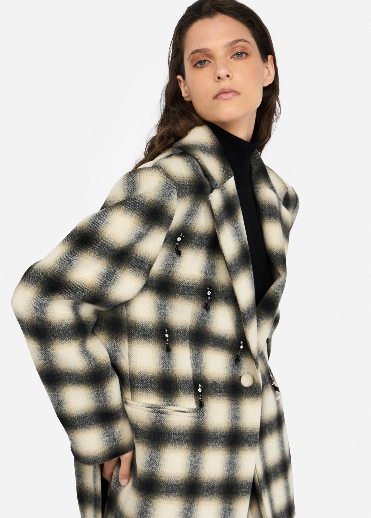 Blazer em mistura de lã com padrão xadrez esfumado em tons de preto, cinza e marfim. O corte reto e a lapela clássica ganham um novo protagonismo através dos bordados joia aplicados à frente — pequenos cristais e missangas negras que criam um brilho subtil e inesperado.