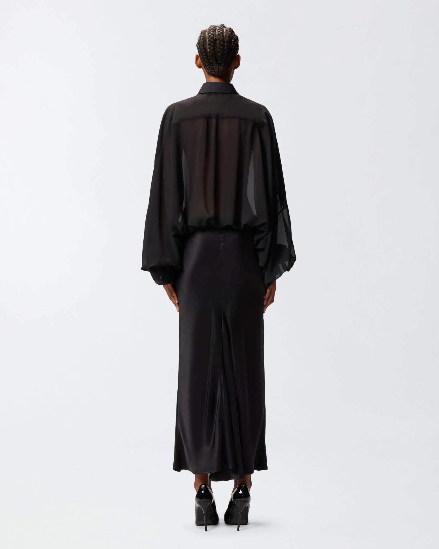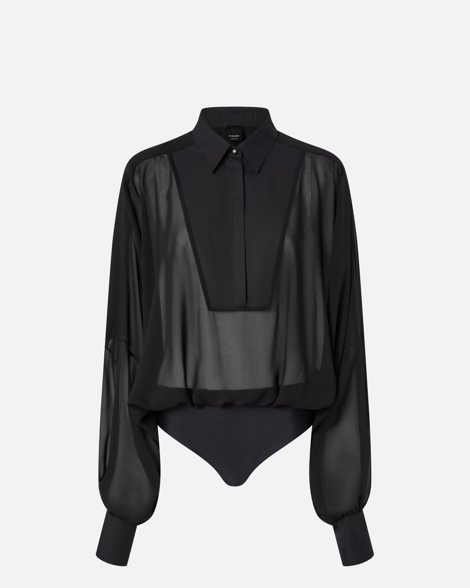 Body com design de blusa, confeccionado em chiffon de seda poliéster, um tecido leve e fluido sobre a pele. O design destaca o elegante jogo de contrastes proporcionado pelas linhas suaves e femininas do corpo e das mangas, e pelos detalhes de inspiração masculina, como a gola de camisa e a pala frontal em popeline de algodão, com um acabamento mate refinado. Este modelo não esquece o brilho, graças aos botões cravejados nos punhos e na parte frontal, e é completado por um prático fecho de corpo estilo body com três presilhas.