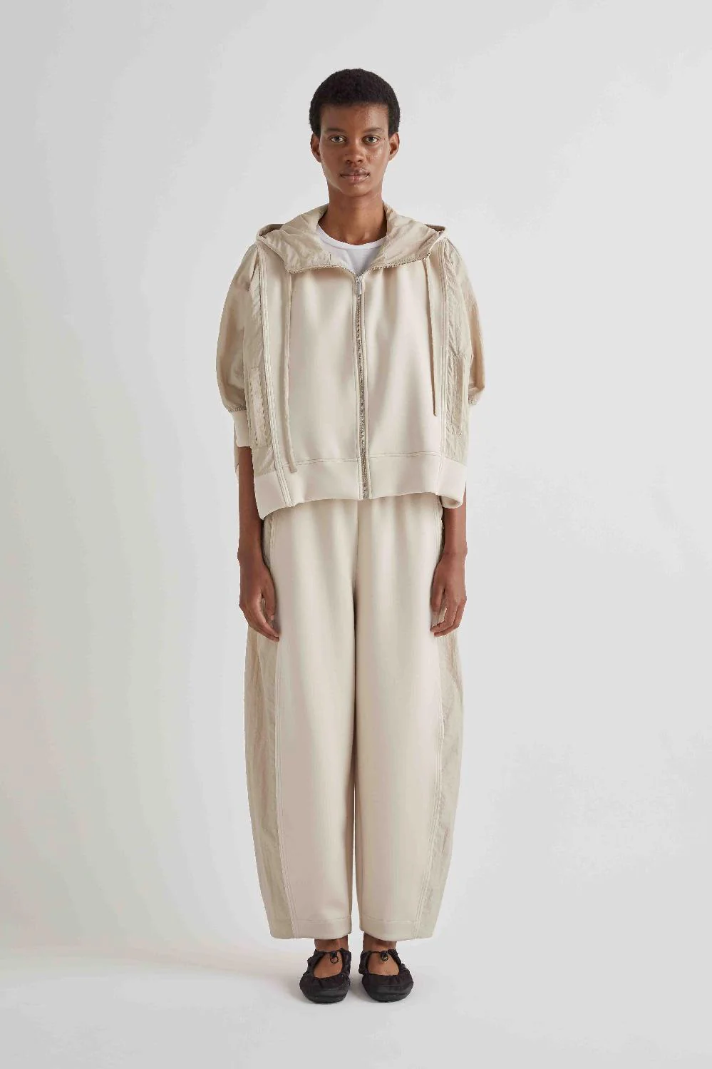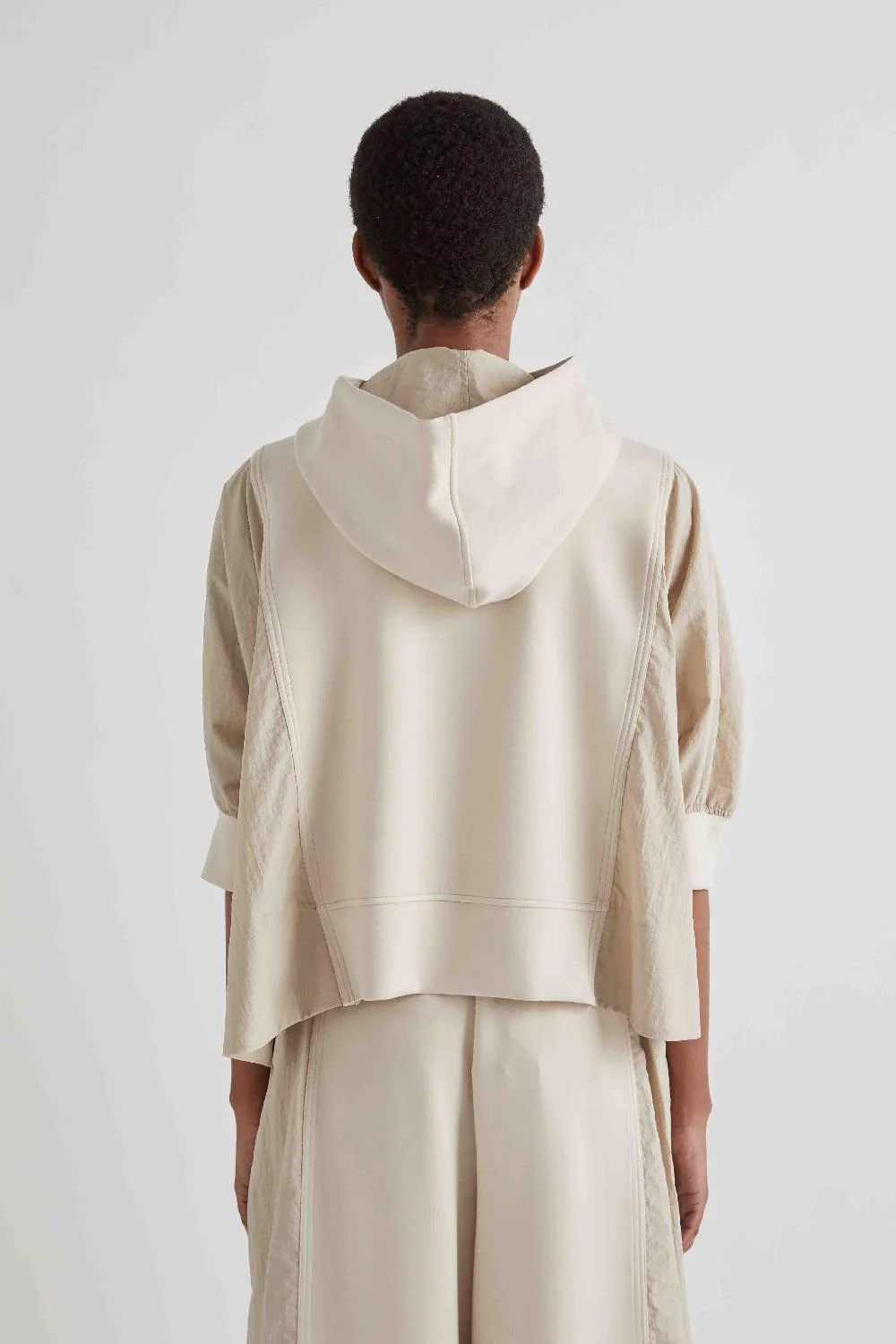 The perfect balance between sporty and sophisticated, this combined hoodie jacket features mixed textures and clean, relaxed lines.