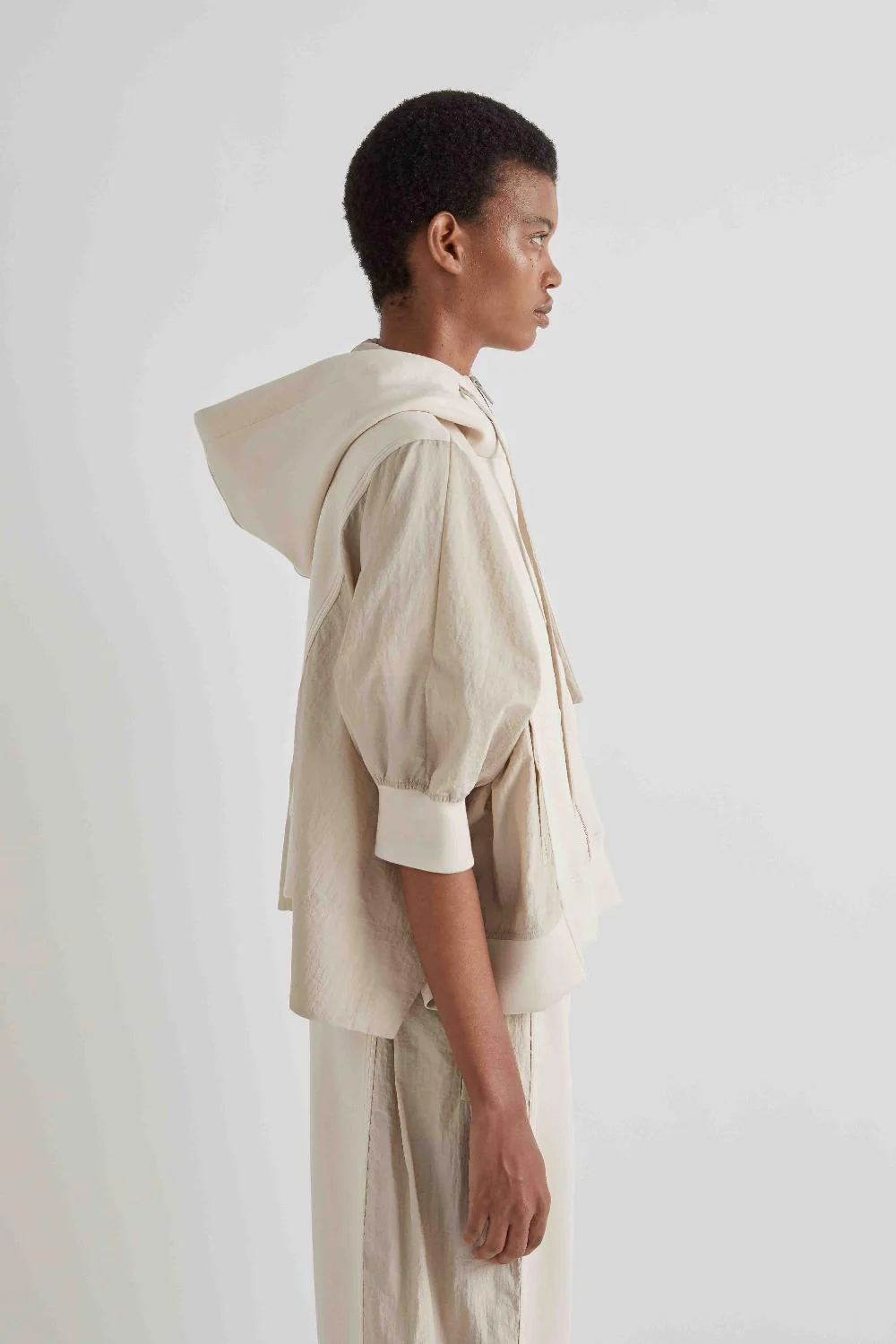 O capuz com cordão e a manga curta acrescentam uma atitude contemporânea e funcional, enquanto o fecho de correr metálico confere um toque urbano discreto.