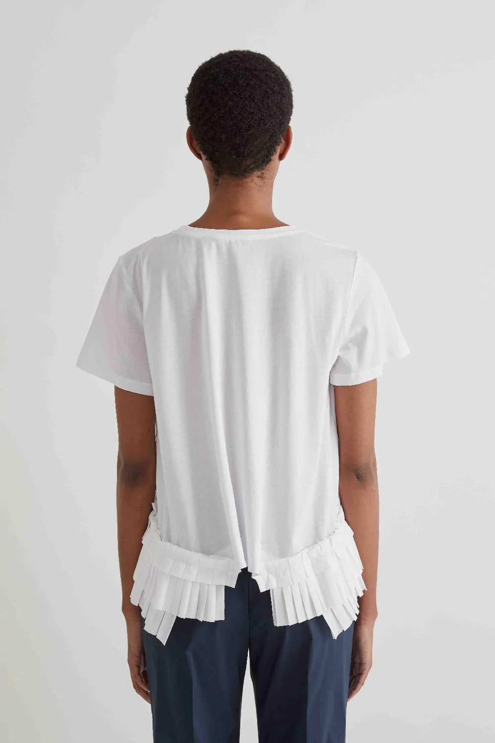 Crafted in soft cotton jersey, it features a relaxed silhouette contrasted by feminine pleated inserts at the hem, adding depth and movement.