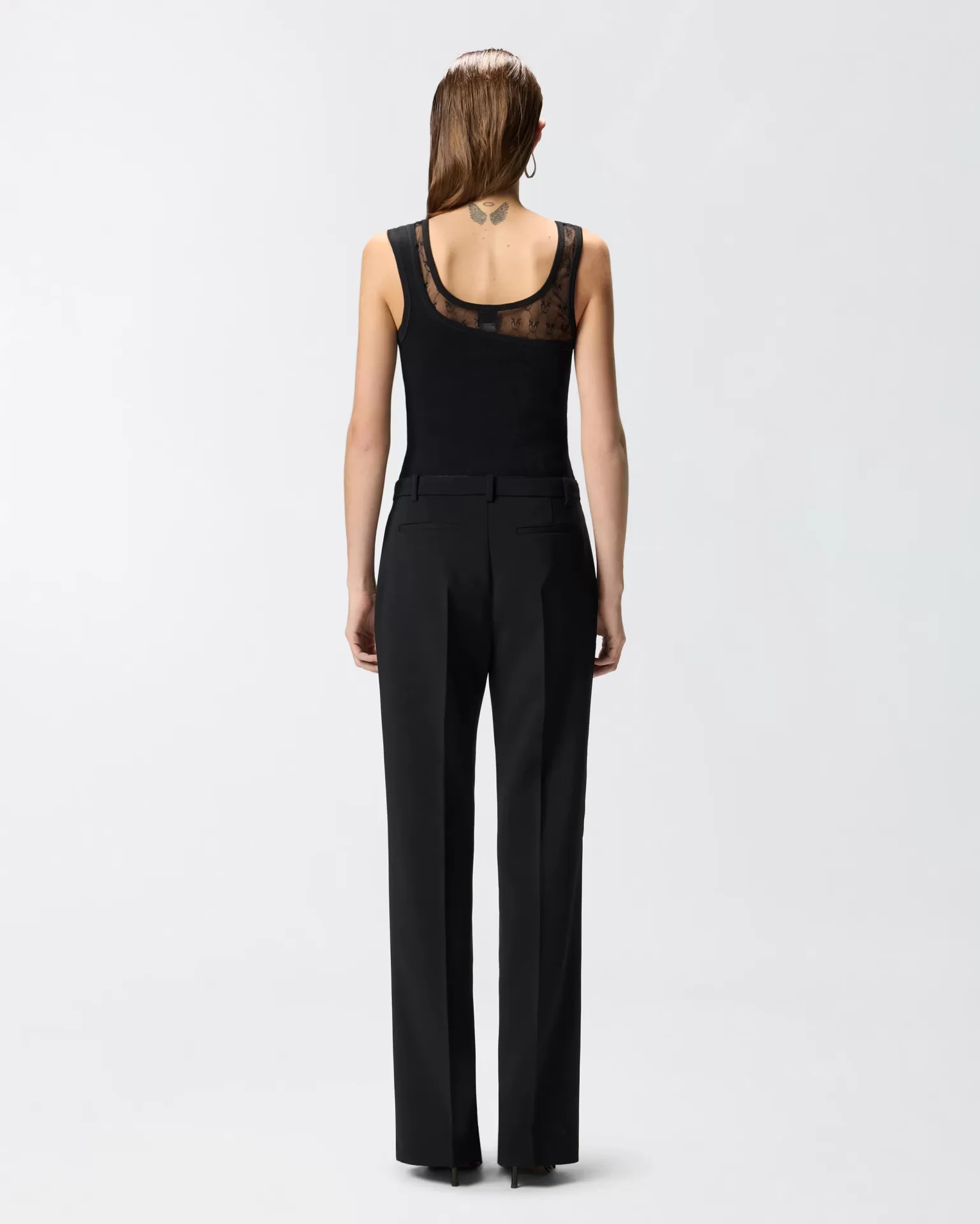 Uma silhueta contemporânea que eleva o essencial. Esta camisola sem mangas Pinko combina uma base de malha fina em algodão elástico com painéis de renda translúcida estampada com o icónico logótipo Love Birds, criando um diálogo subtil entre suavidade e atitude urbana. A linha do decote redonda e o corte justo valorizam a figura com uma elegância sem esforço, perfeita para transitar do dia para a noite.