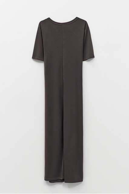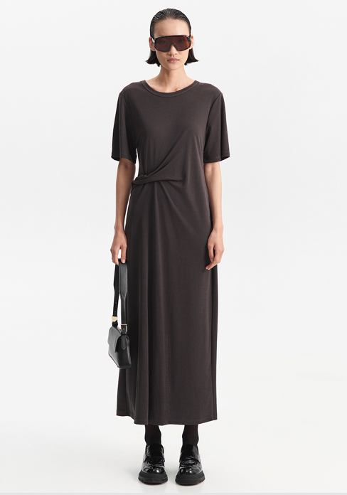 Long fluid knit dress in soft modal blend, featuring a side knot detail that adds gentle draping to the waist.