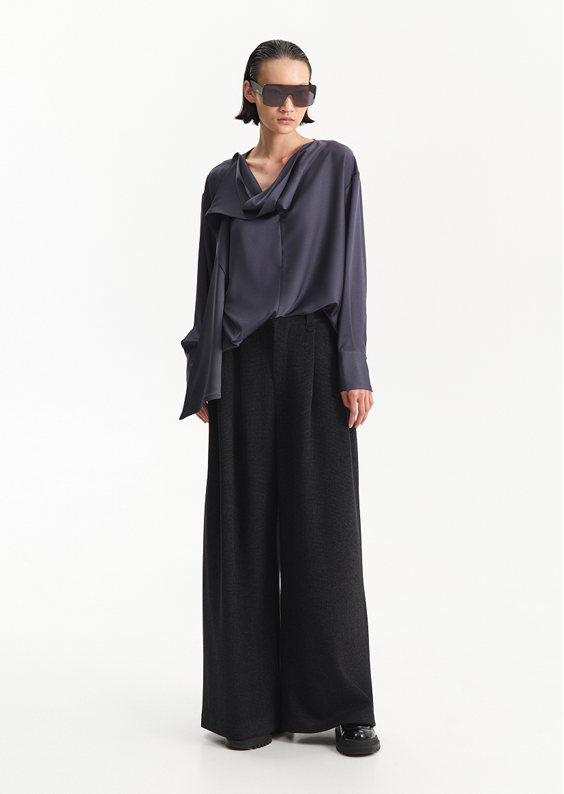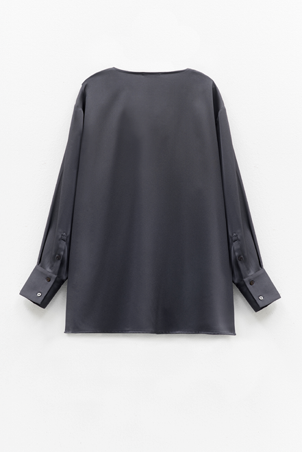 Fluid satin blouse in a deep grey tone, featuring a softly draped neckline that extends into a loose tie detail.