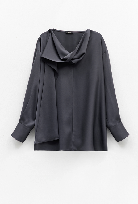 Blusa em cetim fluido num tom cinza escuro sofisticado, com decote drapeado que se prolonga num laço solto.