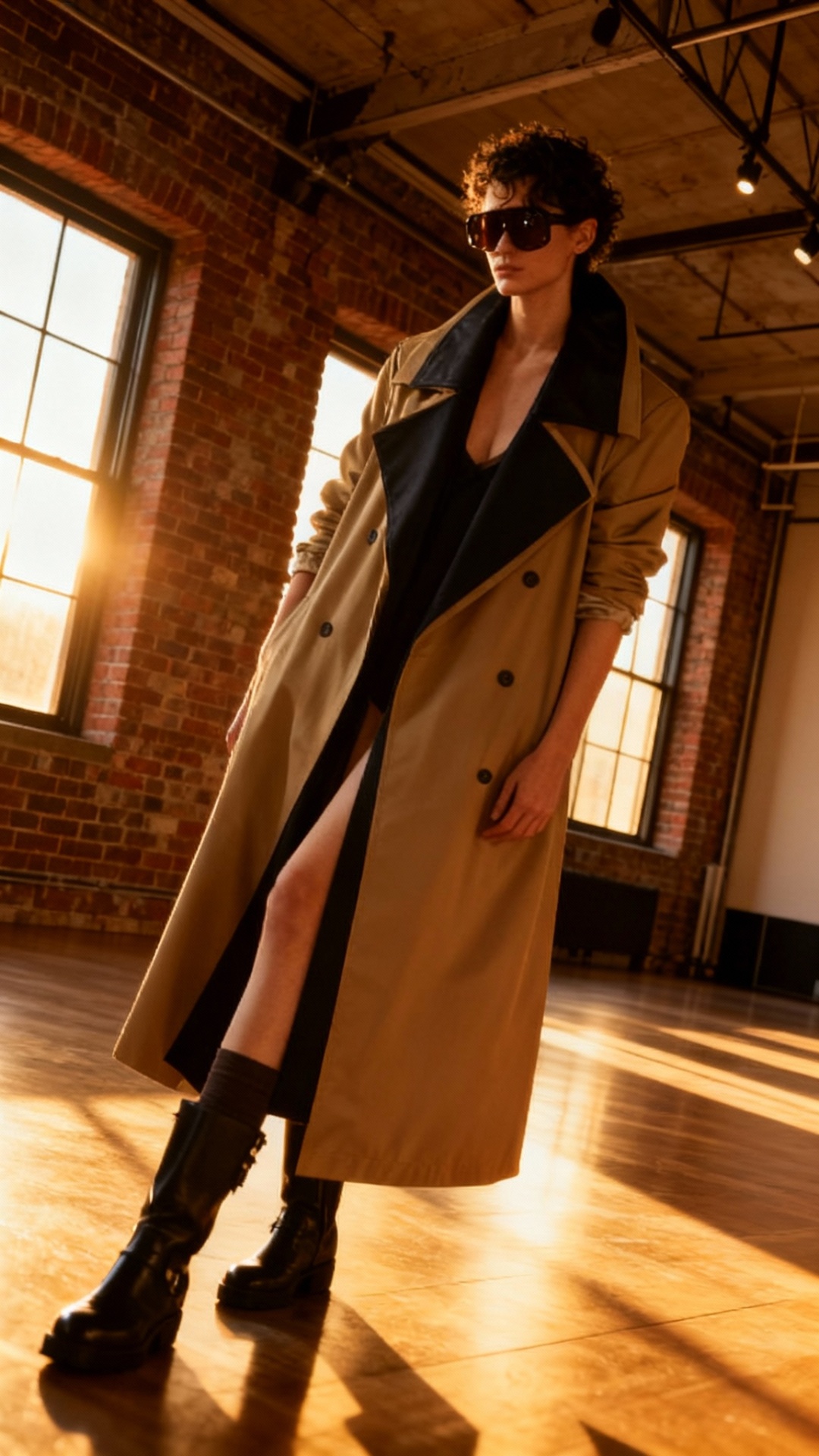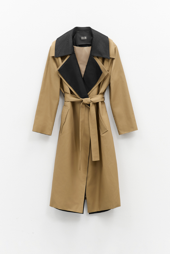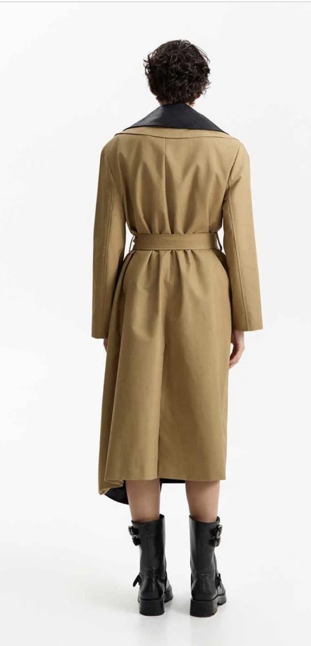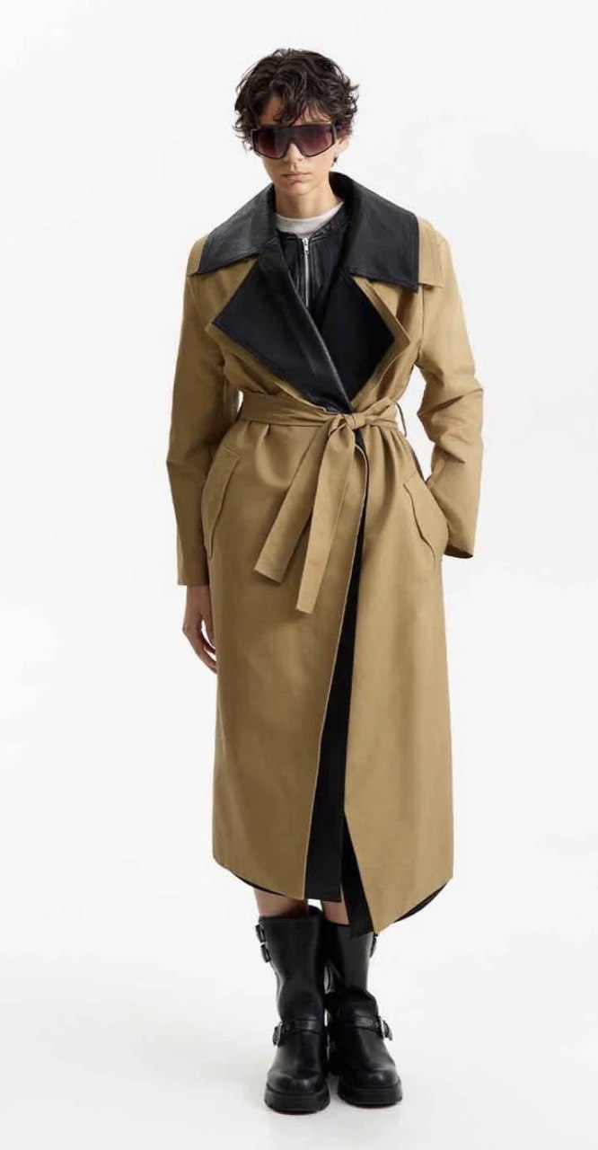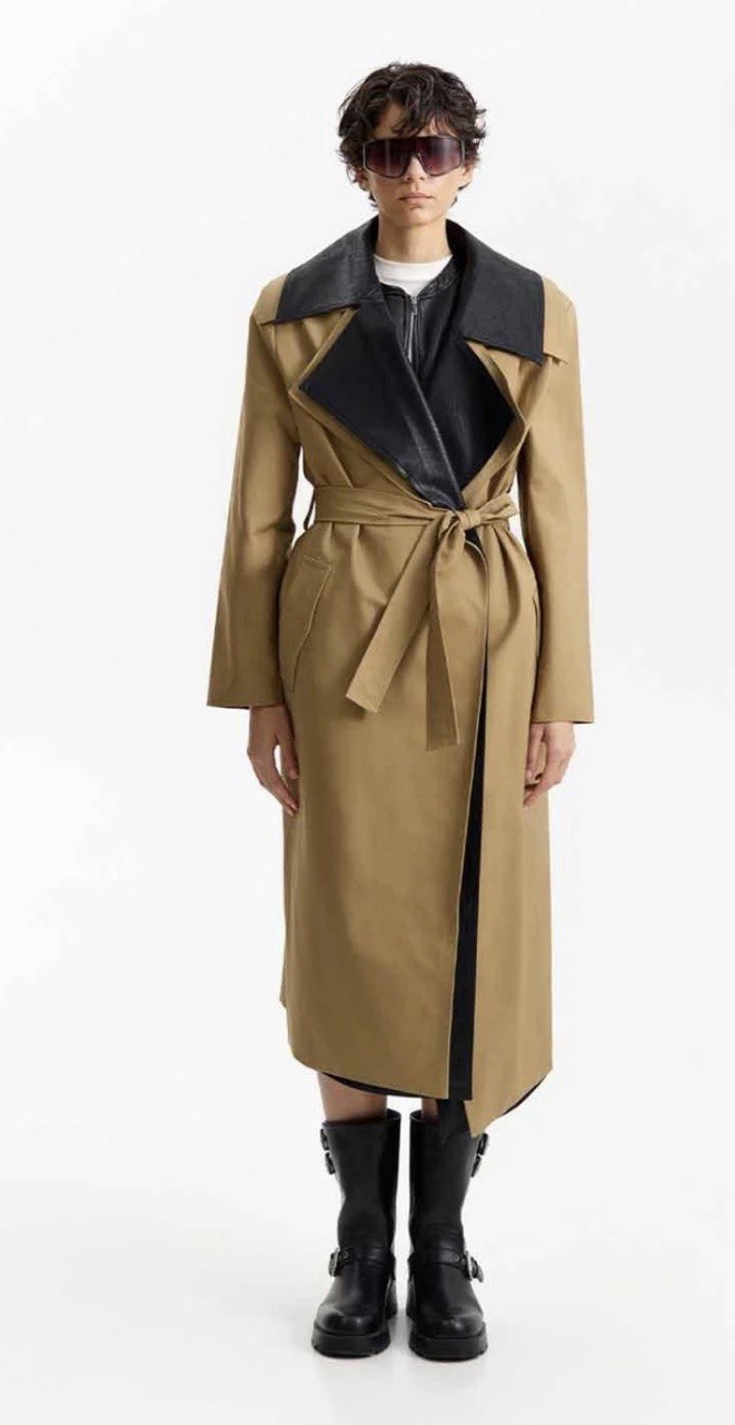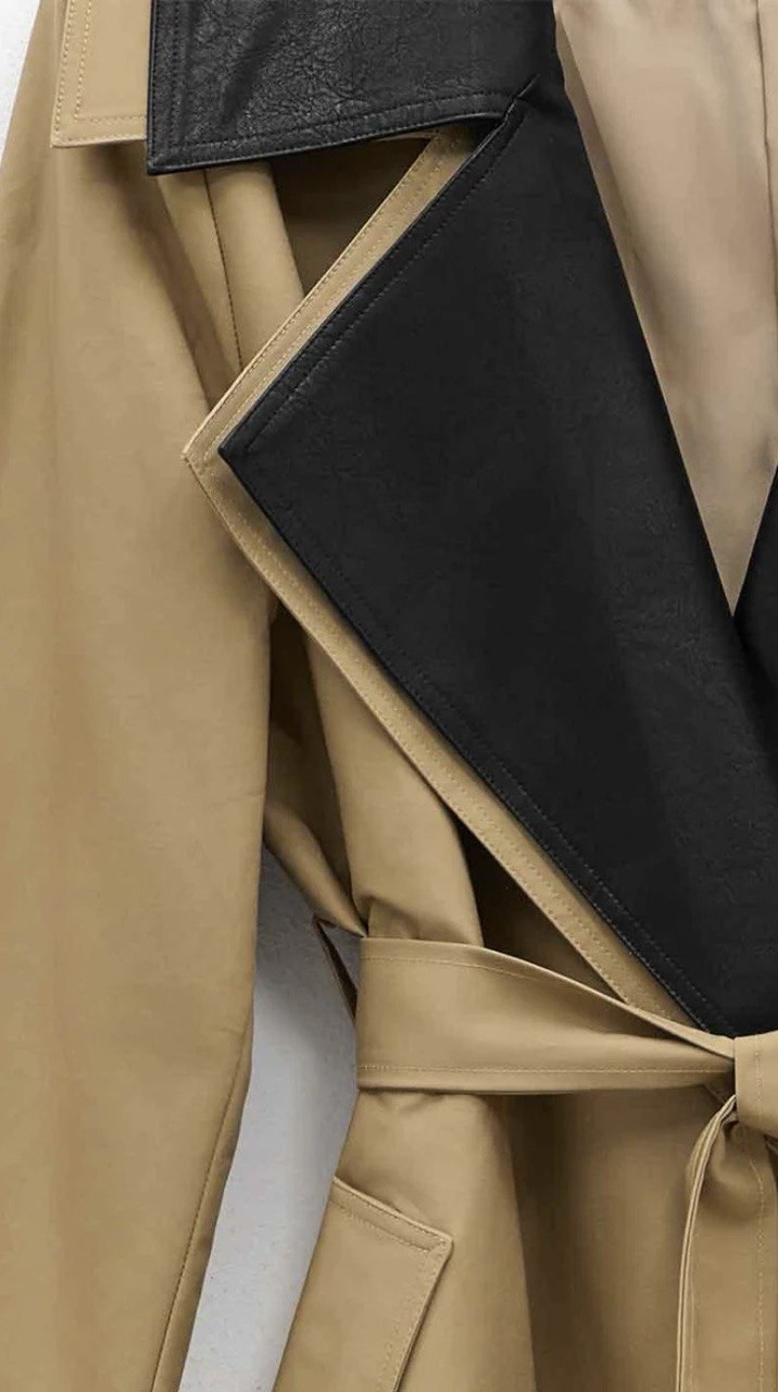 Double camel trench coat with black leather— sculptural elegance with urban contrast.