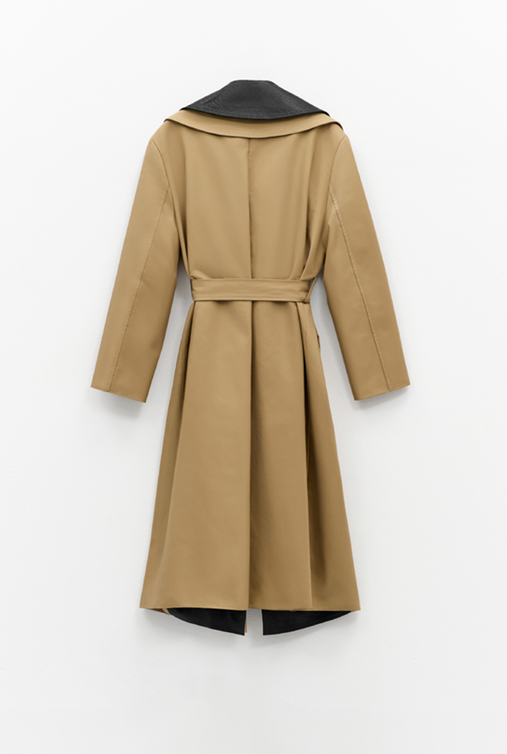 Trench coat em algodão com gola e interior contrastantes em pele de tom preto, reinterpretando o clássico num registo contemporâneo e escultural.