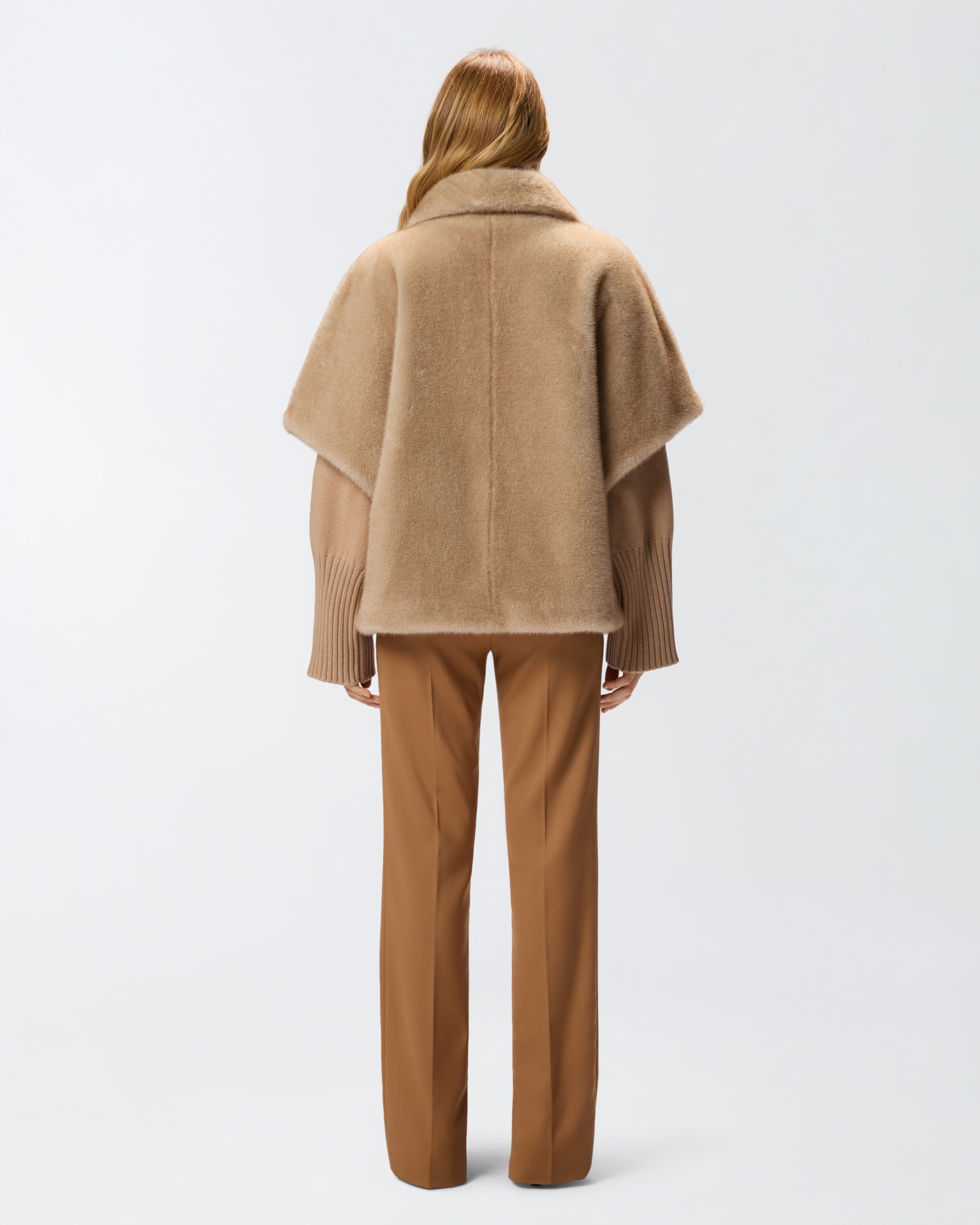 Envolva-se em suavidade e elegância com esta capa curta em tecido Aspen, de toque luxuosamente macio e textura efeito pelo. O modelo apresenta mangas curtas, bolsos embutidos e gola alta estruturada com fecho lateral em fivela, combinando funcionalidade com um conforto sofisticado.