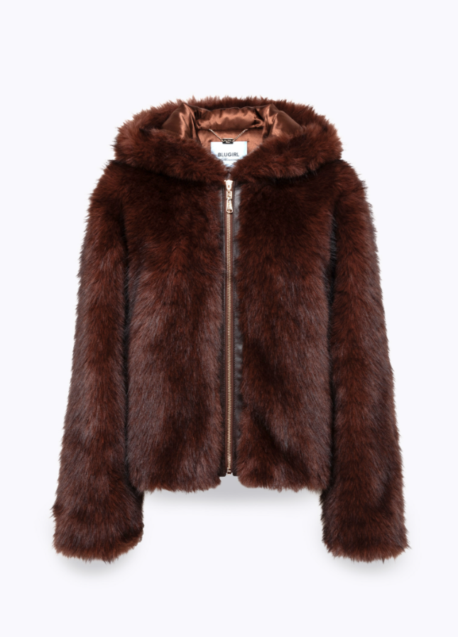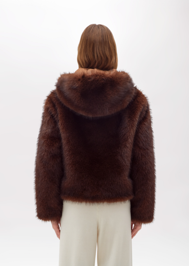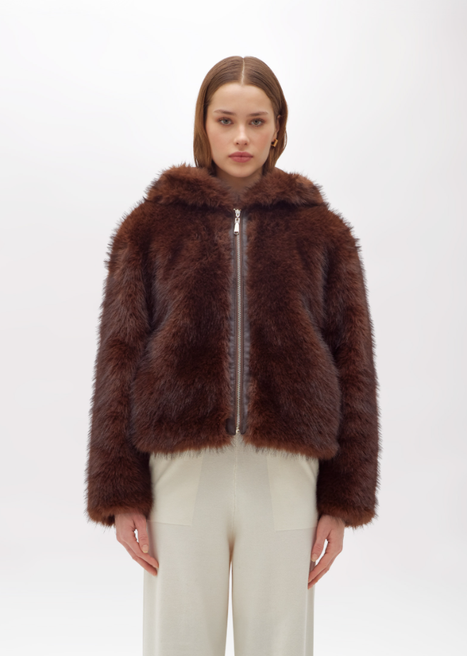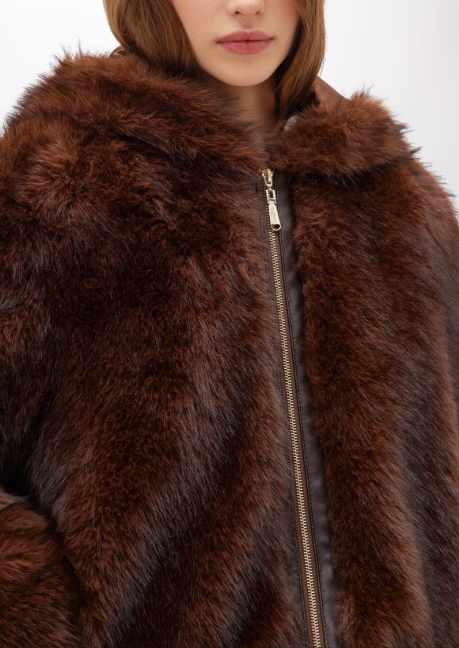 This faux fur jacket brings an urban touch to seasonal outerwear while keeping it elegant and versatile. Crafted with a dense and soft texture, it features an integrated hood, front zip fastening with faux leather trim, discreet side pockets, and long sleeves. The satin lining adds comfort and a refined finish.