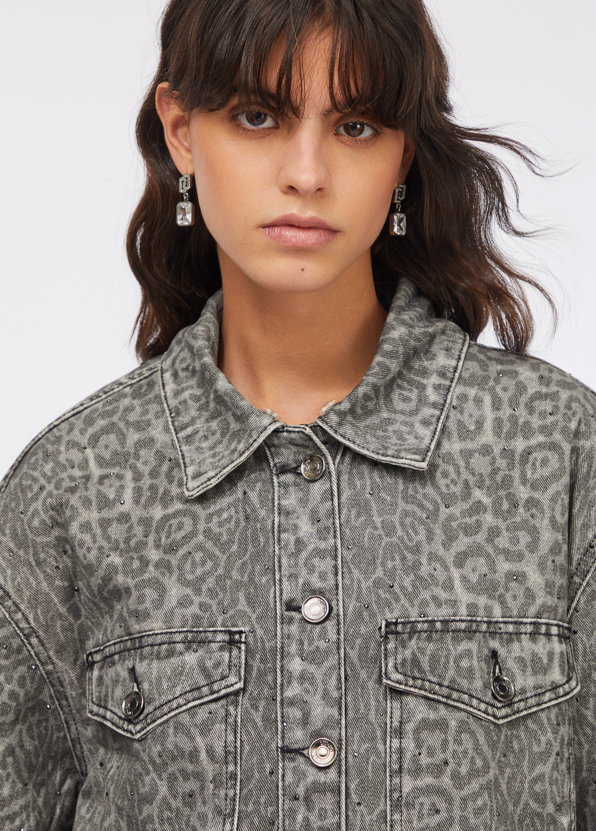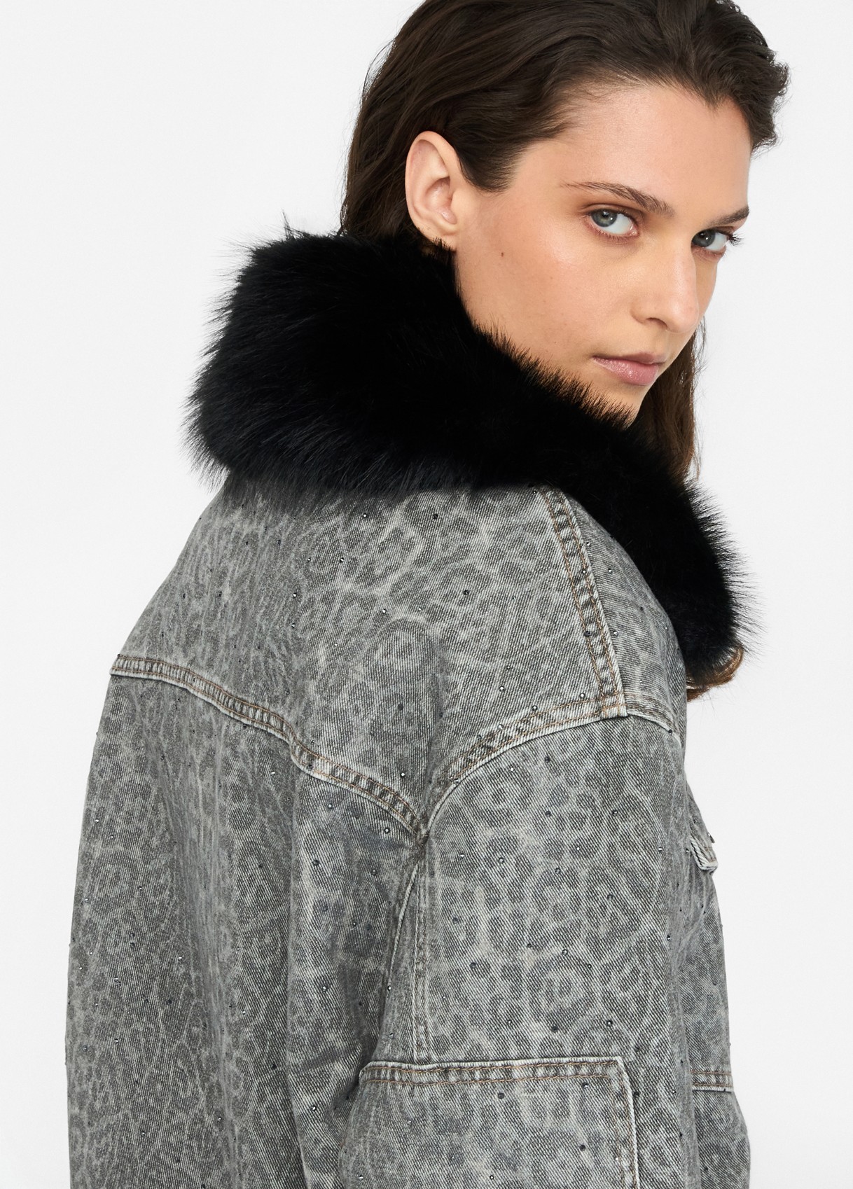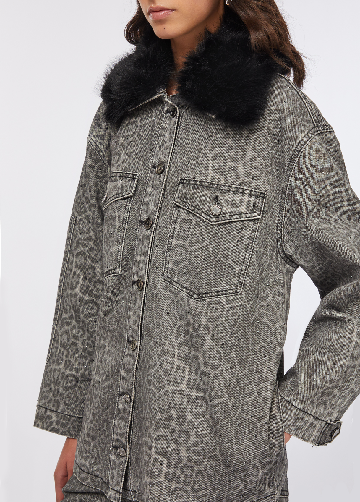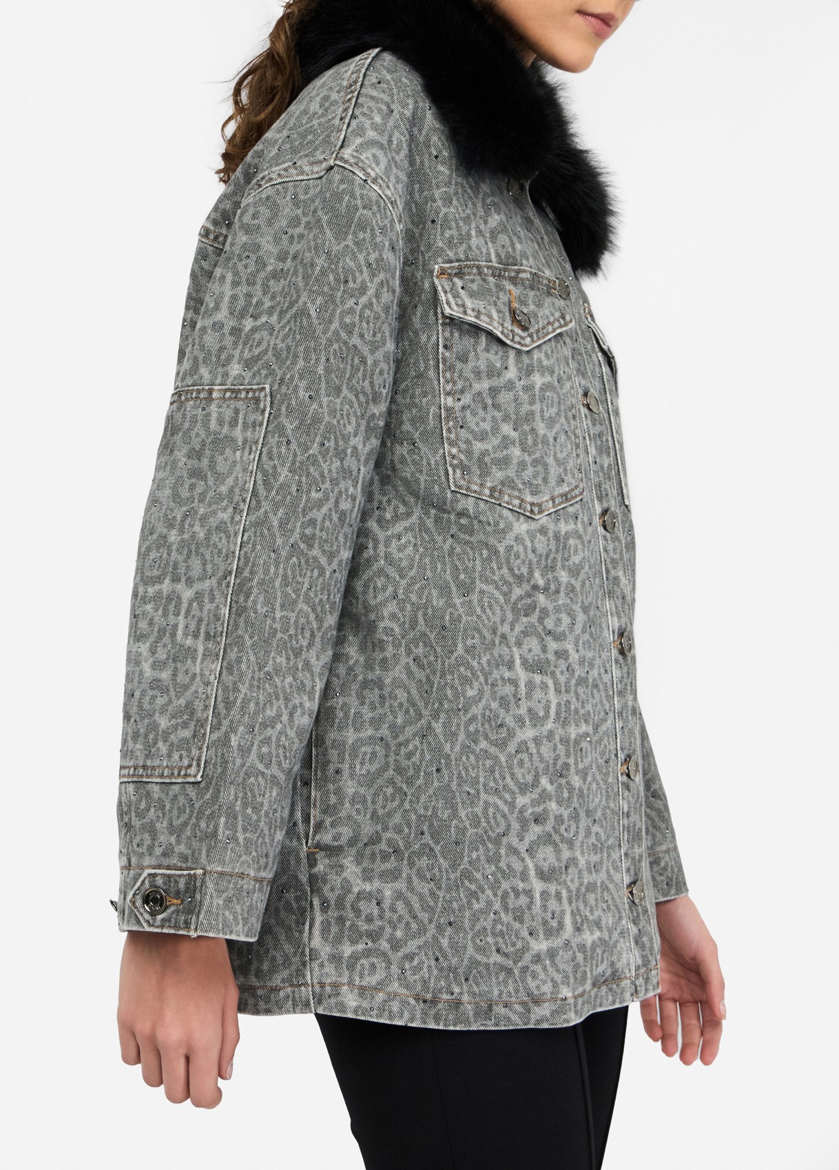 Da coleção Evening Knitwear, este casaco em tecido 100% algodão com estampado animal combina atitude urbana e sofisticação contemporânea. A gola oversized em pêlo sintético preto, totalmente amovível, oferece um toque glamouroso e versátil. Os botões personalizados Liu Jo e os bolsos com aba reforçam o carácter utilitário com um twist luxuoso.