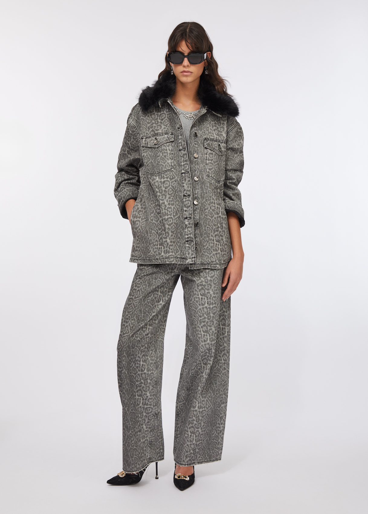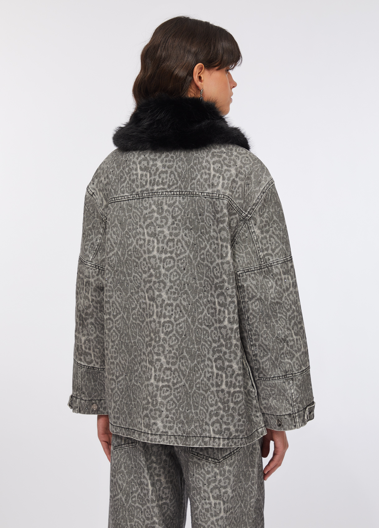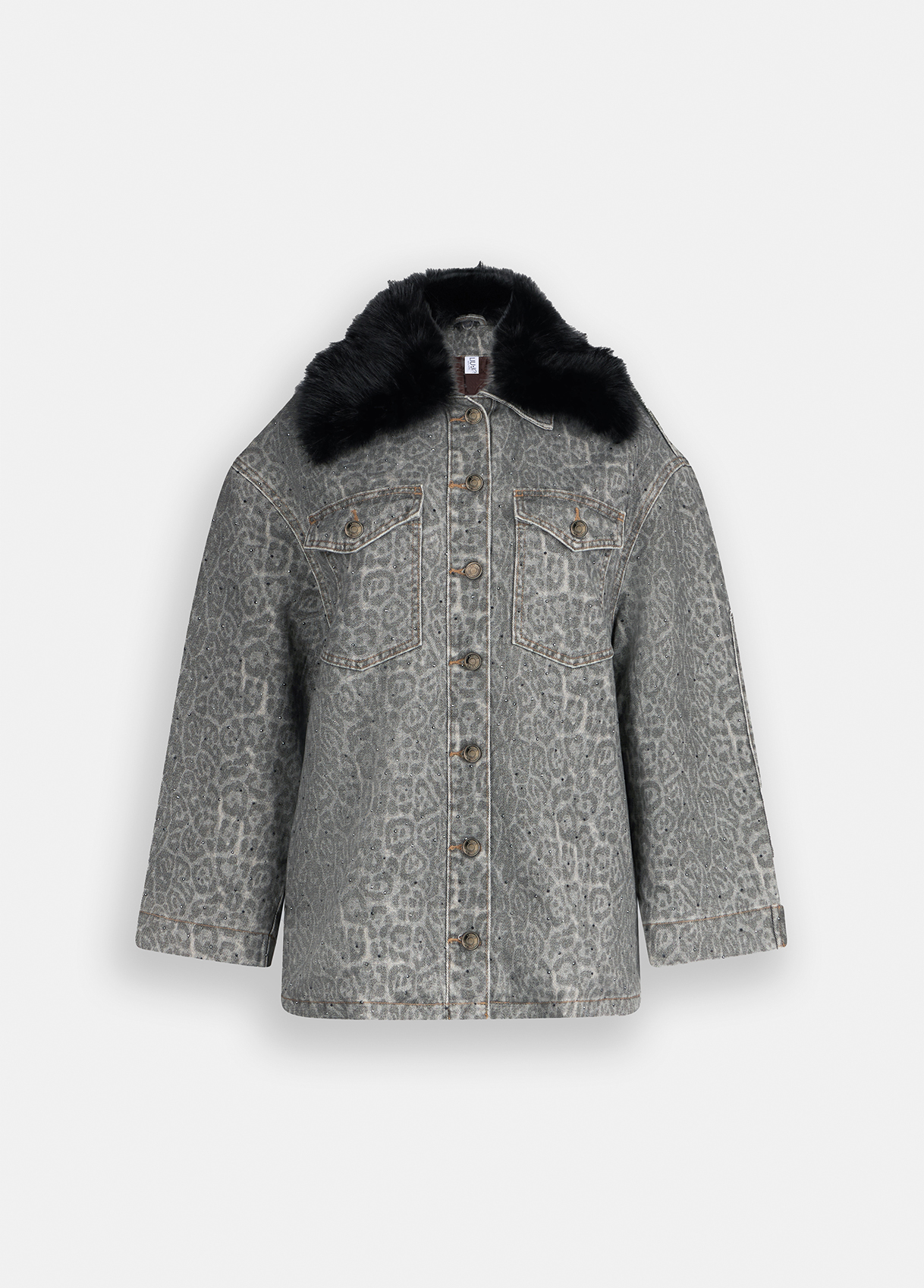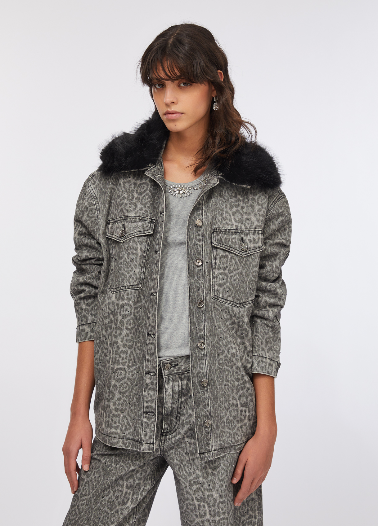 From Liu Jo’s Evening Knitwear line, this animal-print jacket is the epitome of urban glamour and modern comfort. Made from 100% cotton fabric, it features a detachable oversized faux fur collar, flap pockets, and branded buttons. The subtle all-over leopard pattern adds depth and attitude, while the plush collar elevates the piece with luxurious flair.