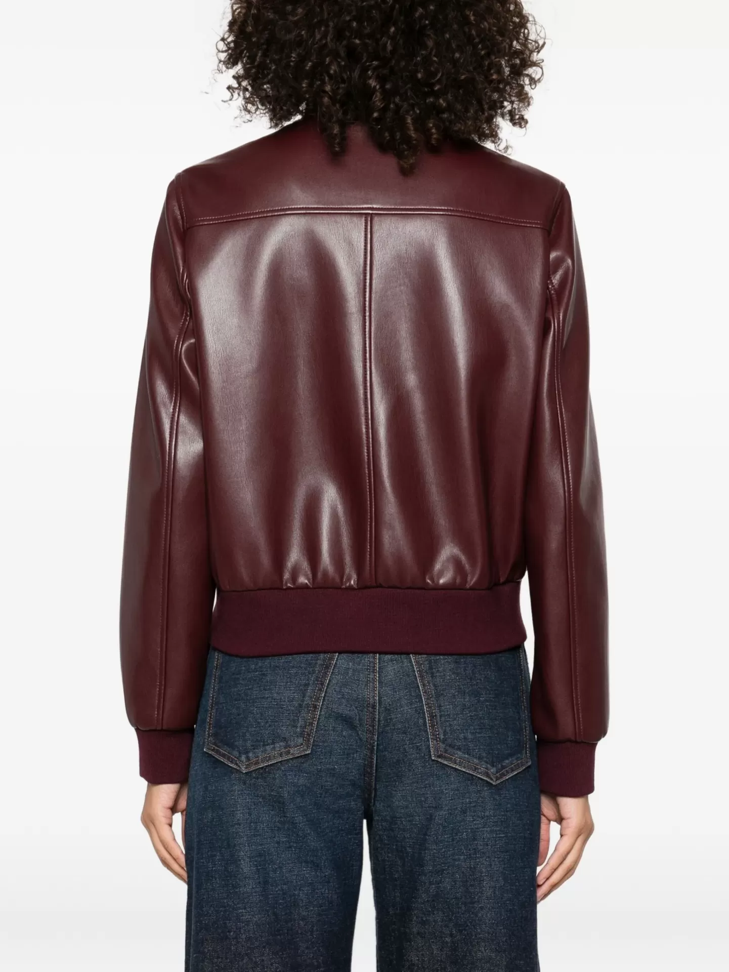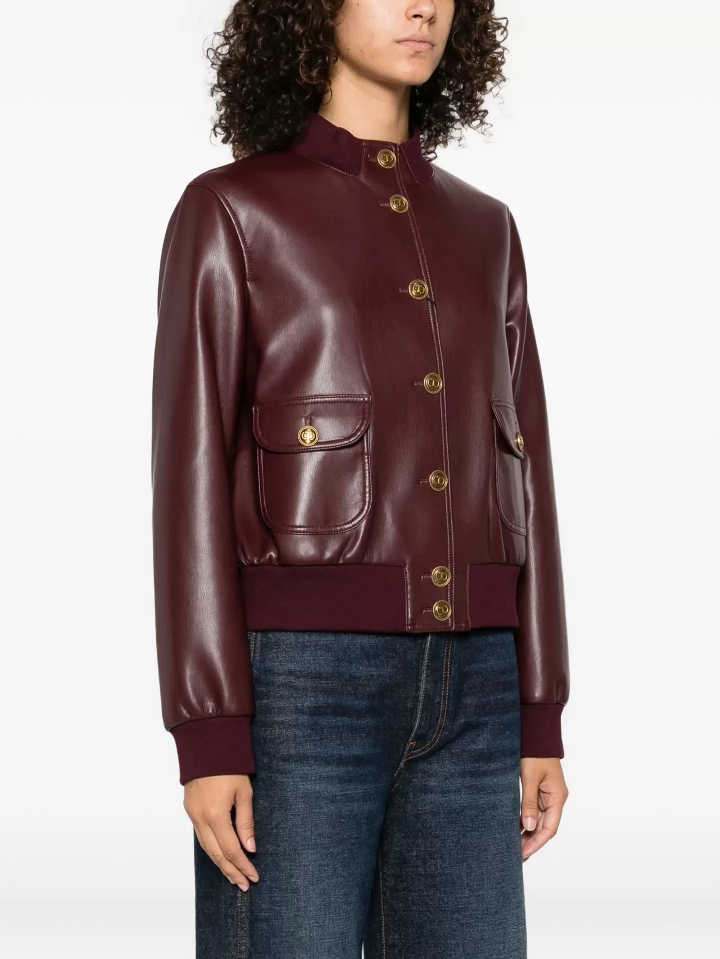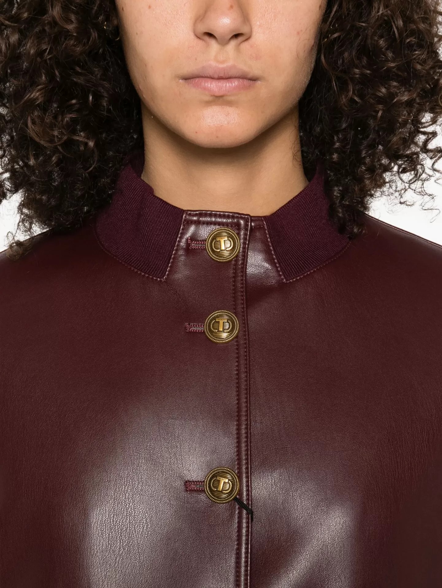 Faux leather jacket with a contemporary urban feel, enhanced by Oval T logo snap buttons in gold for a refined touch. The design features a stand collar, ribbed cuffs and hem, long sleeves, and flap patch pockets with button closure, combining functionality with style.