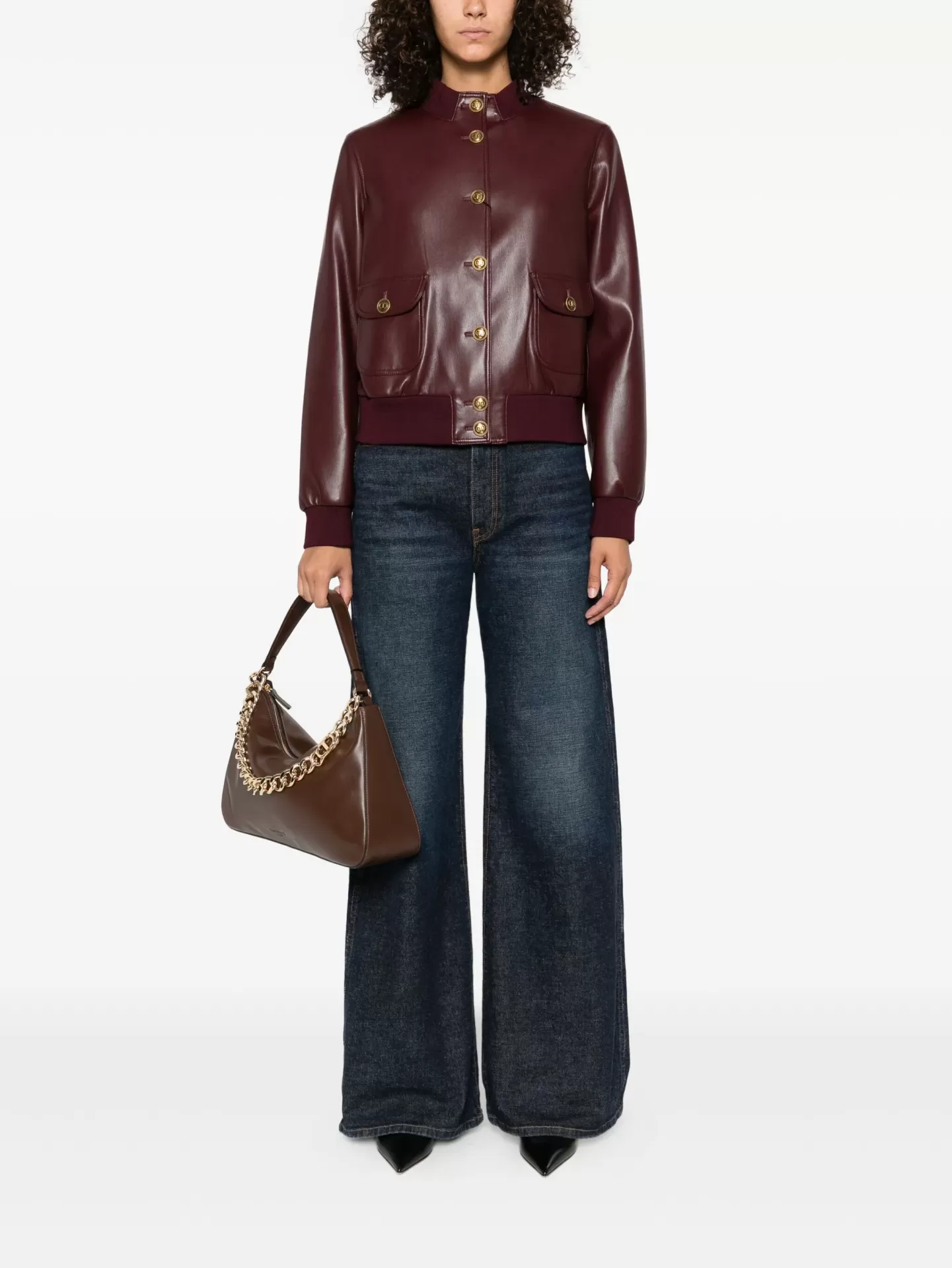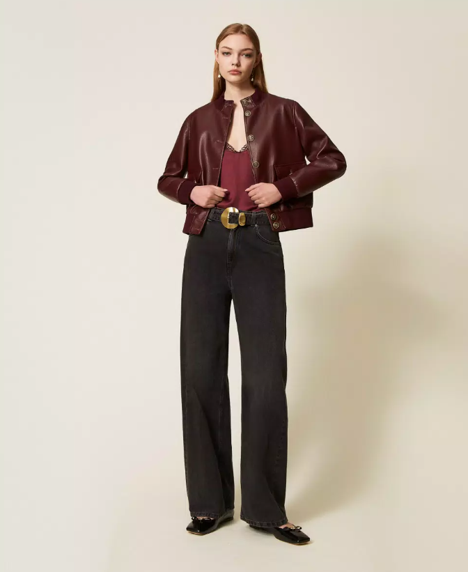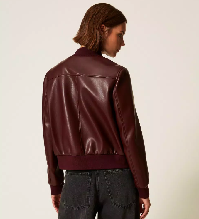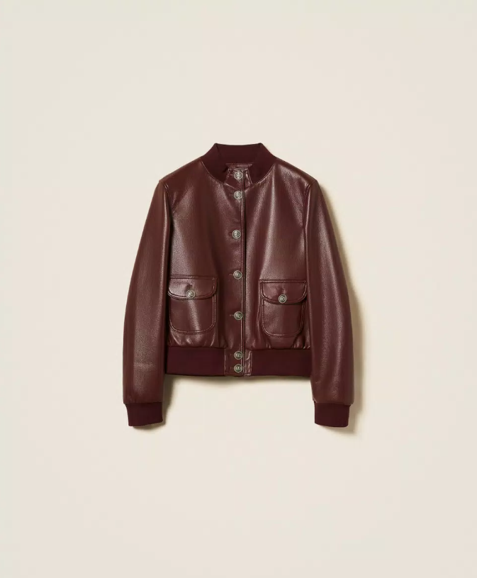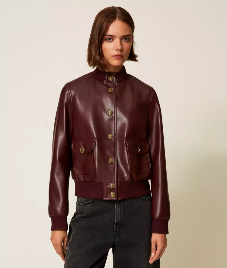 Blusão em pele sintética com um toque contemporâneo e urbano, enriquecido pelos botões de pressão Oval T logo em dourado que elevam a sofisticação. O design apresenta gola subida, punhos e cós em malha canelada, mangas compridas e bolsos aplicados com pala e botão, garantindo funcionalidade sem perder o estilo.