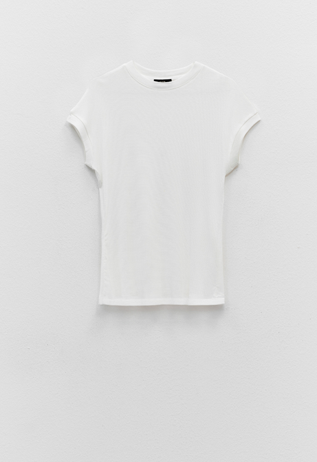 Features a straight cut and rolled short sleeves for a clean, elegant silhouette.