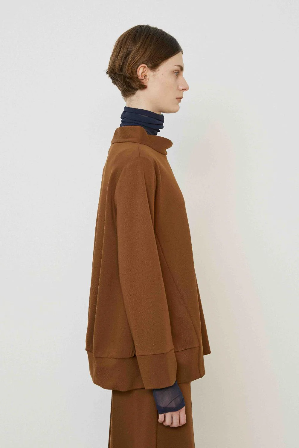 Esta blusa de manga comprida apresenta uma linha ligeiramente evasé e uma gola em forma de cratera, que confere estrutura e elegância arquitetónica à silhueta descontraída.