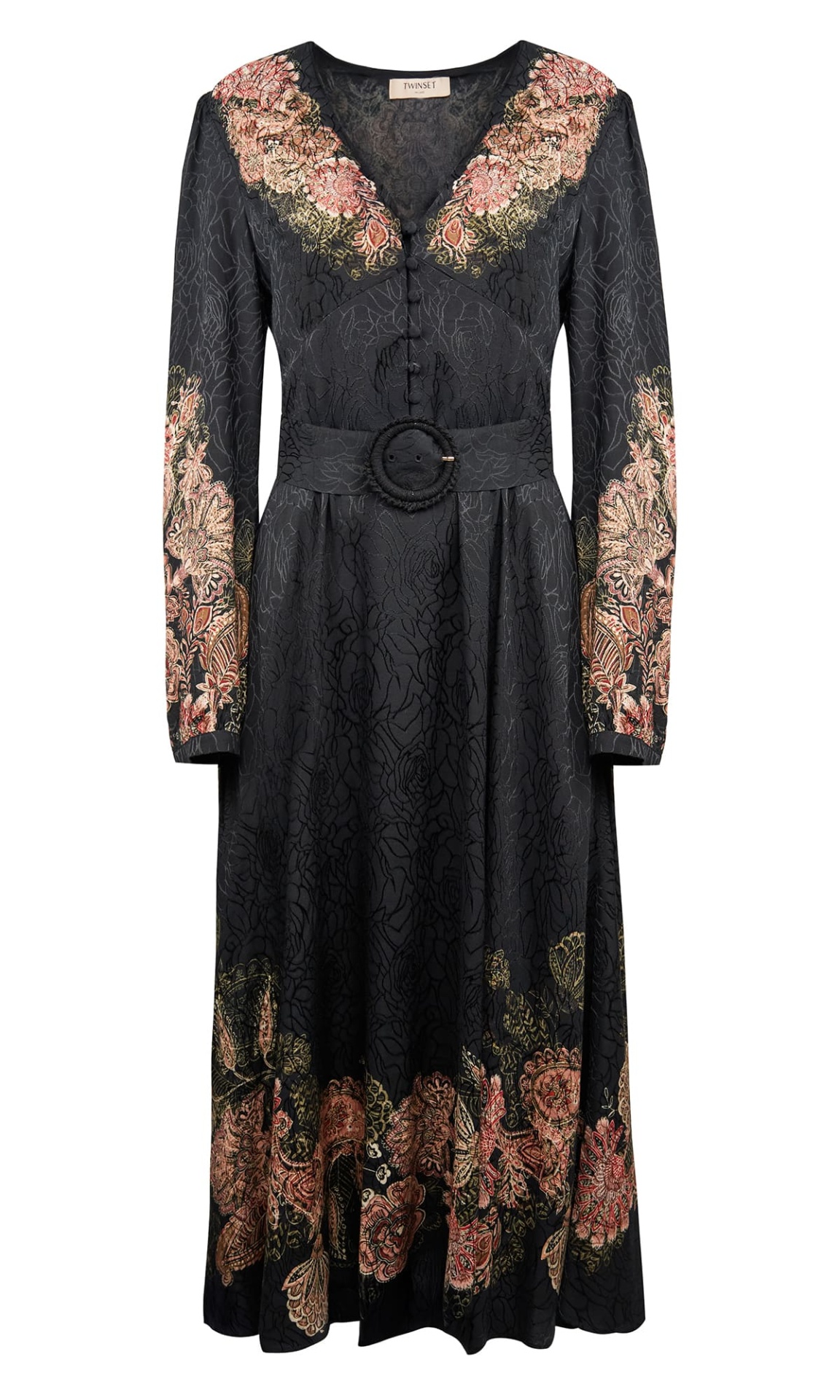 Romantic and sophisticated, this Twinset Milano midi dress is crafted from high-quality viscose jacquard, featuring a tonal floral pattern enriched with delicate embroidery in warm hues along the neckline, sleeves and hem.