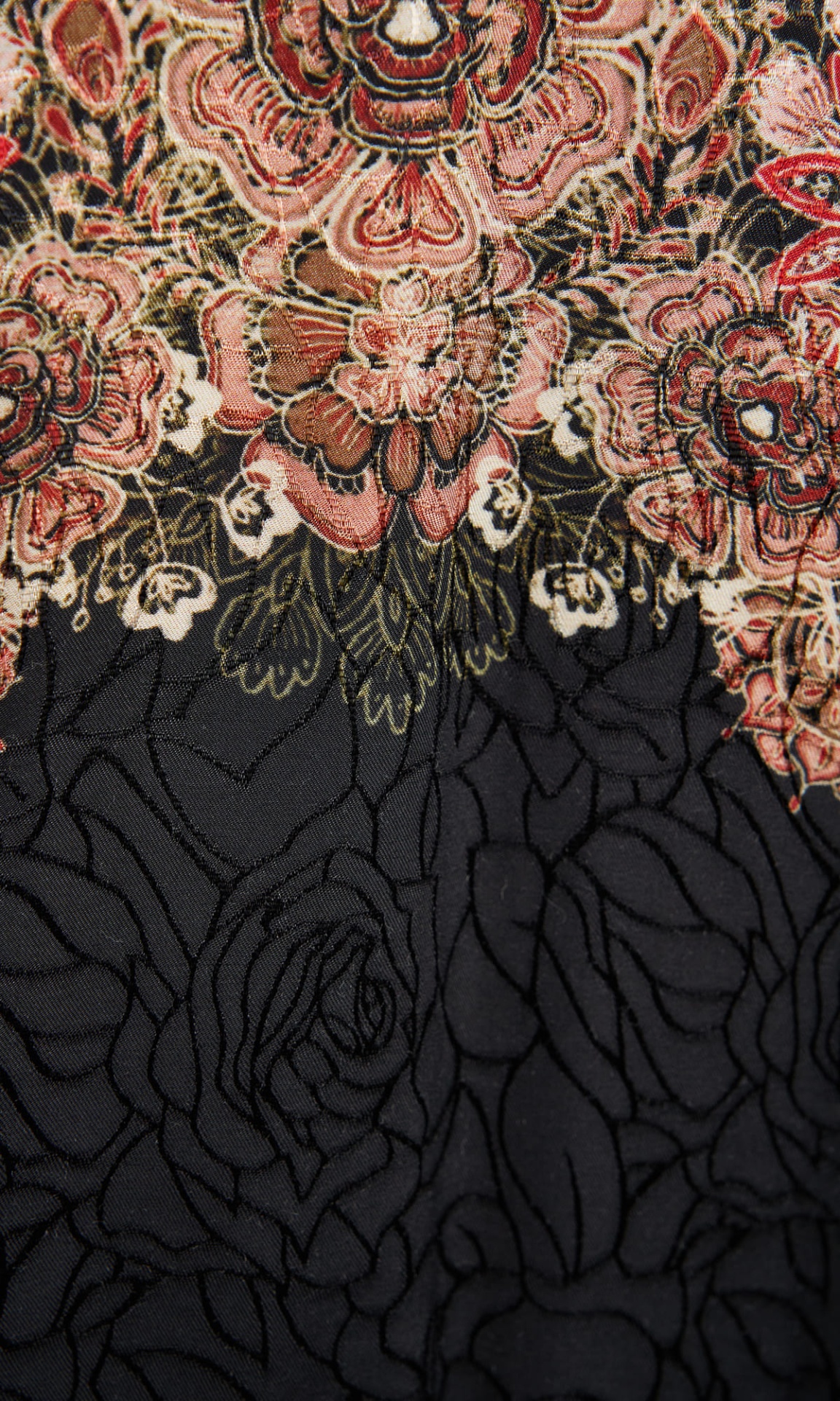 Its luxurious texture and deep black base create an elegant contrast with the intricate florals, evoking an aura of timeless refinement.