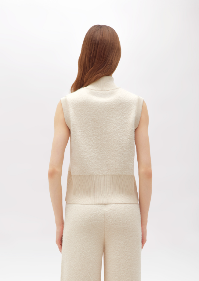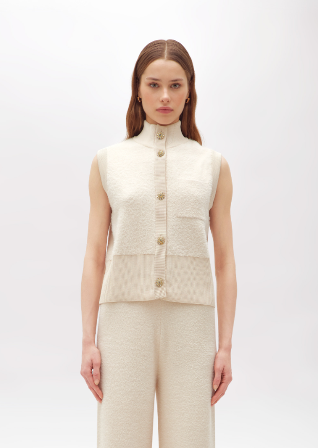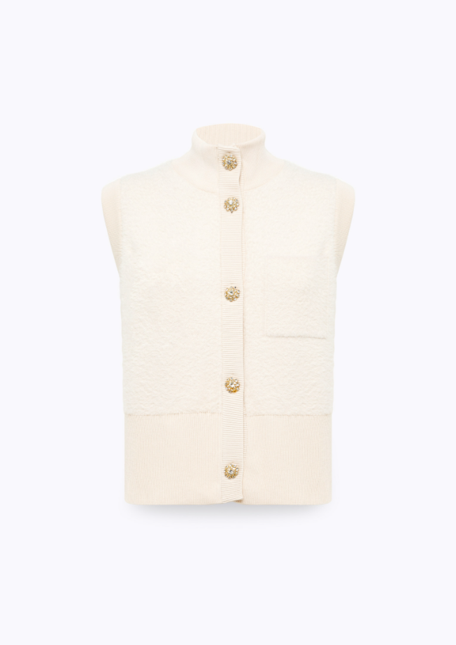 Elevate your wardrobe with this fur-effect knit vest, blending comfort and sophistication in a minimalist silhouette. The high collar and jewel button closure add a touch of refinement, while the applied pocket and wide ribbed hem create a balanced, modern structure. Crafted from soft polyamide and polyester yarns, this piece embodies tactile luxury.