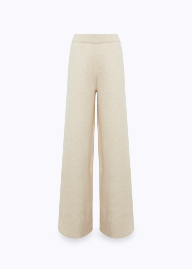 Elegância essencial num modelo confortável e sofisticado. Estas calças de malha com efeito pelo distinguem-se pela perna reta e fluida, conferindo uma silhueta leve e moderna. O modelo pull-on com cintura elástica oferece praticidade e conforto ao vestir. Fáceis de combinar com qualquer peça do guarda-roupa, são perfeitas com o colete ou casaco coordenado, criando um look monocromático e requintado — ideal para dias de inverno com um toque de suavidade.