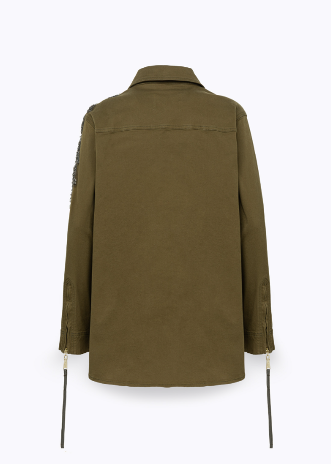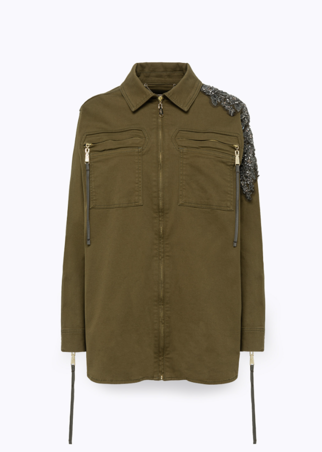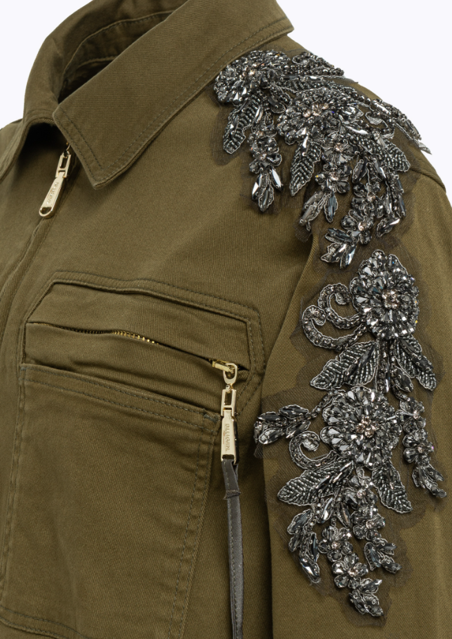 Casaco tipo field jacket em sarja de algodão elástico, com aplicações manuais de pedraria e missangas no ombro, que conferem um toque feminino e sofisticado à estética utilitária.