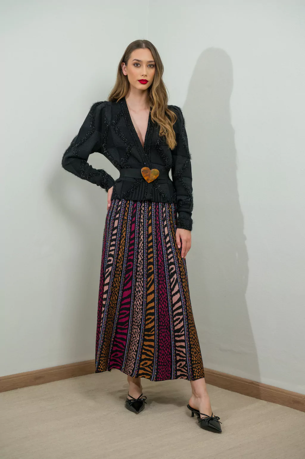 O cós em tricot preto com elastano garante um ajuste perfeito e confortável, adaptando-se ao corpo com naturalidade. O design versátil permite coordenar com blusas de seda, camisas estruturadas ou malhas justas, ideal para um look que transita do dia para a noite.