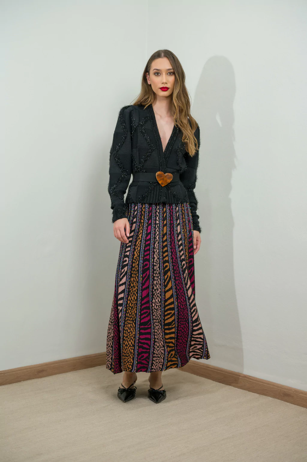 A Saia Hellen é um ícone de estilo contemporâneo, desenhada para quem valoriza a elegância e o conforto. Produzida em tricot gode com listras estampadas multicoloridas, esta peça destaca-se pela fluidez e movimento, criando uma silhueta sofisticada e feminina.