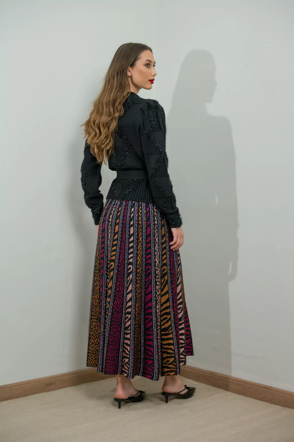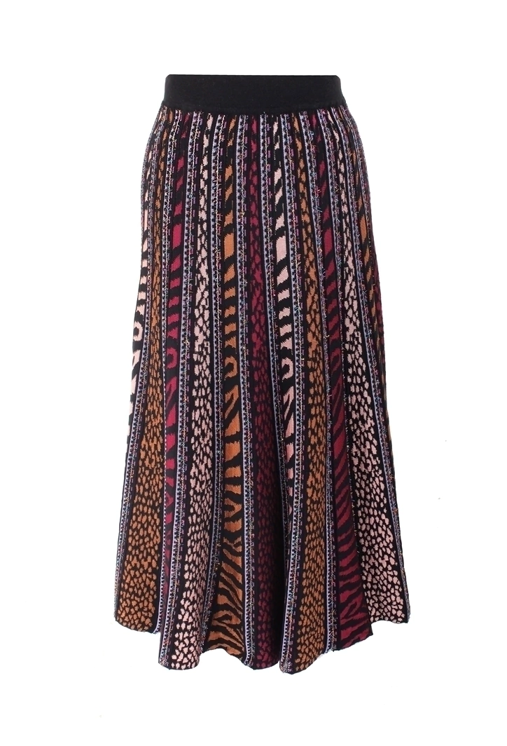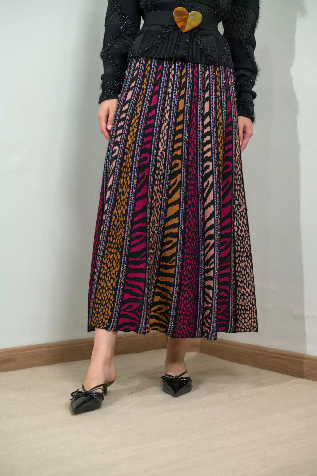 The Hellen Skirt is a statement of contemporary style, designed for those who value elegance and comfort. Crafted from flared knit with multicoloured printed stripes, this piece stands out for its fluidity and graceful movement, creating a sophisticated and feminine silhouette.