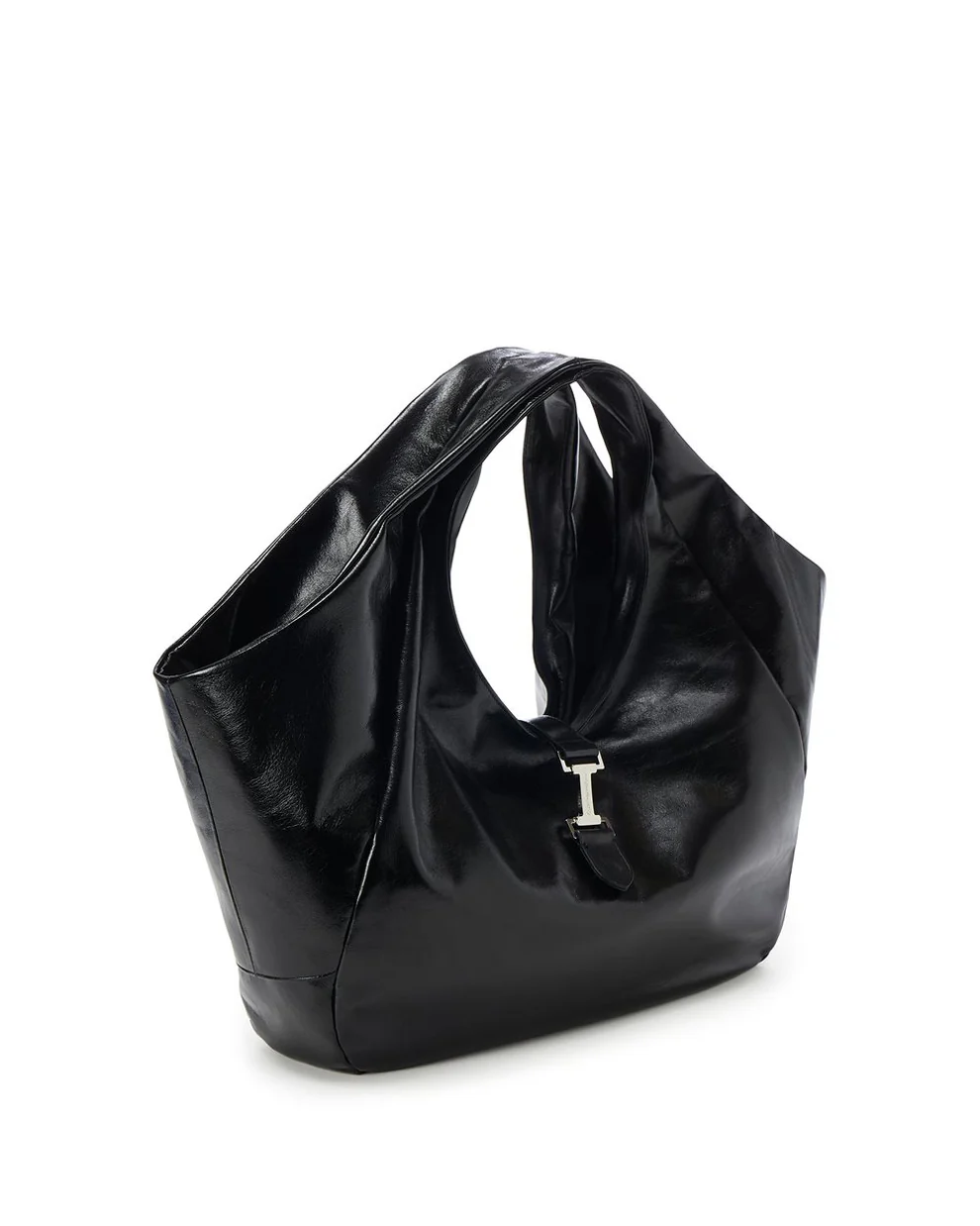 Enhance an all-black outfit with this glossy leather tote and sculptural silver earrings, or pair it with dark denim and a camel coat for a chic texture contrast.