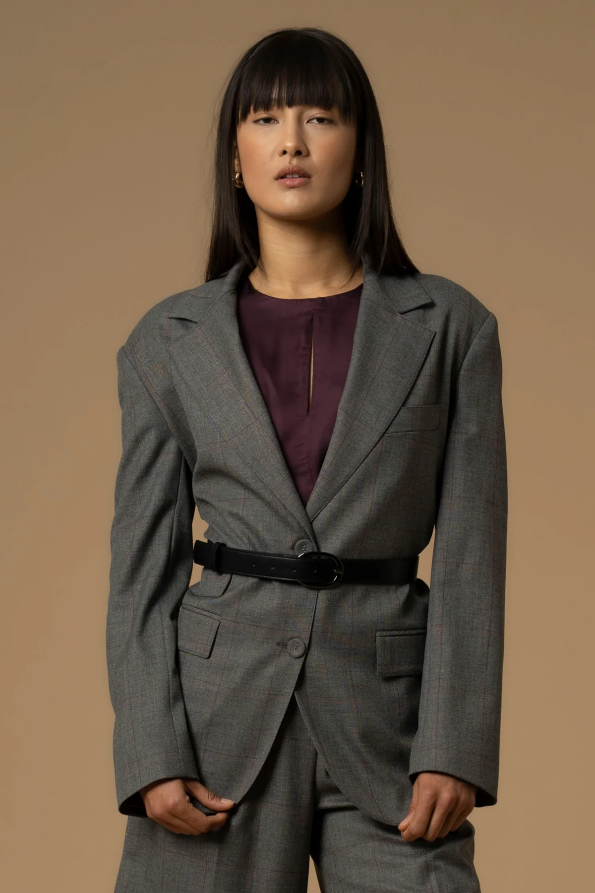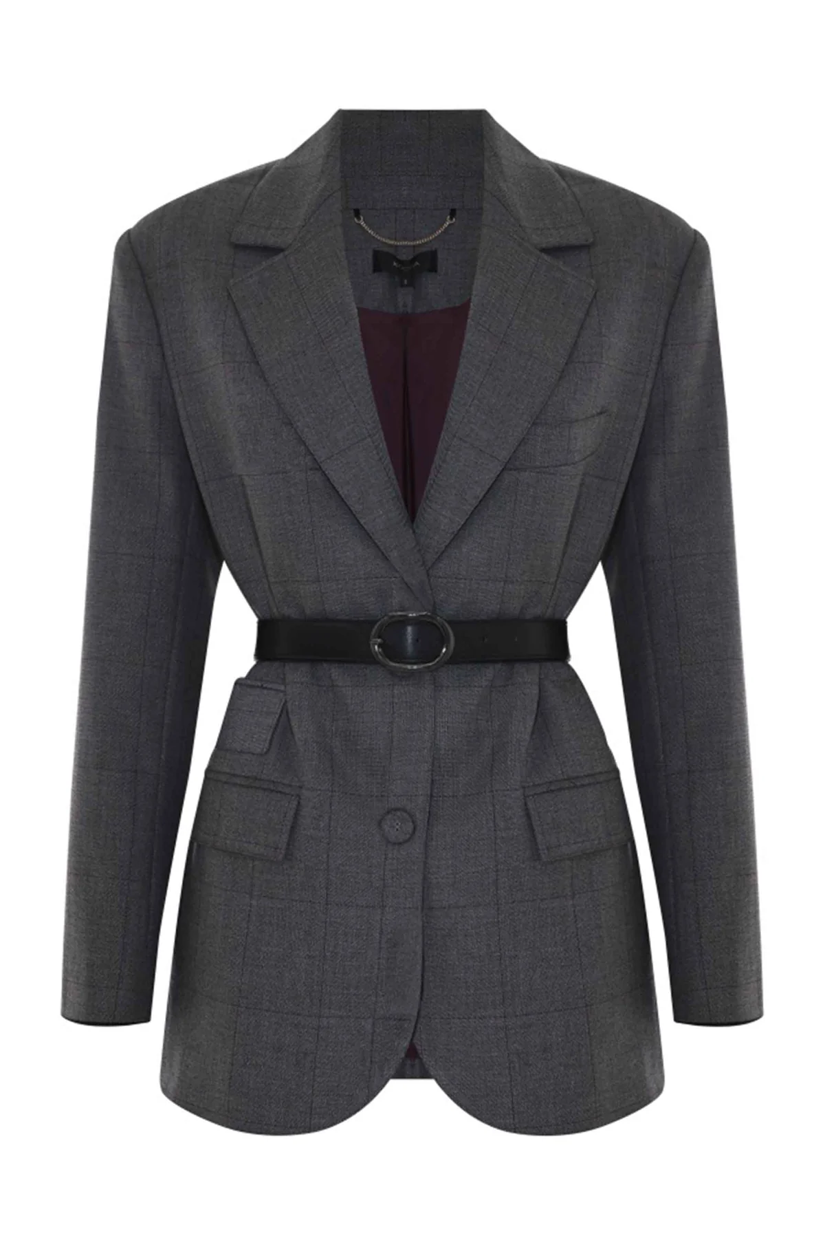 The Kocca long blazer brings timeless elegance with a modern twist. Designed in a soft grey check pattern with bordeaux undertones, it features a single-button closure, flap pockets, and a contrasting belt with a chrome buckle that cinches the waist for a sleek, feminine silhouette. Perfect for office wear or city styling, it blends classic tailoring with contemporary edge.
