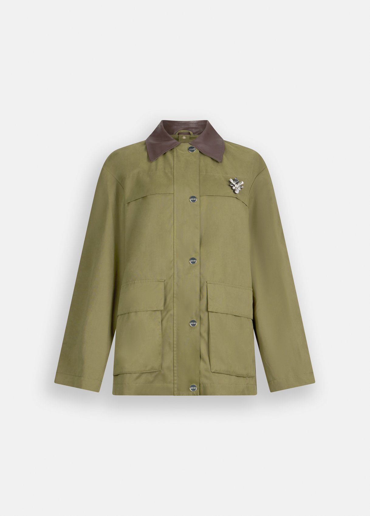 Jaqueta utilitária reinterpretada com sofisticação. Confeccionada em mistura de algodão, com gola em tecido revestido e aplicação de joias bordadas, apresenta bolsos amplos, fecho de correr de duas vias e capuz oculto. Inclui ainda colete interior estampado removível que garante versatilidade e conforto. Uma peça-chave que traduz a tendência militar chic da estação FW25/26, combinando funcionalidade e glamour.